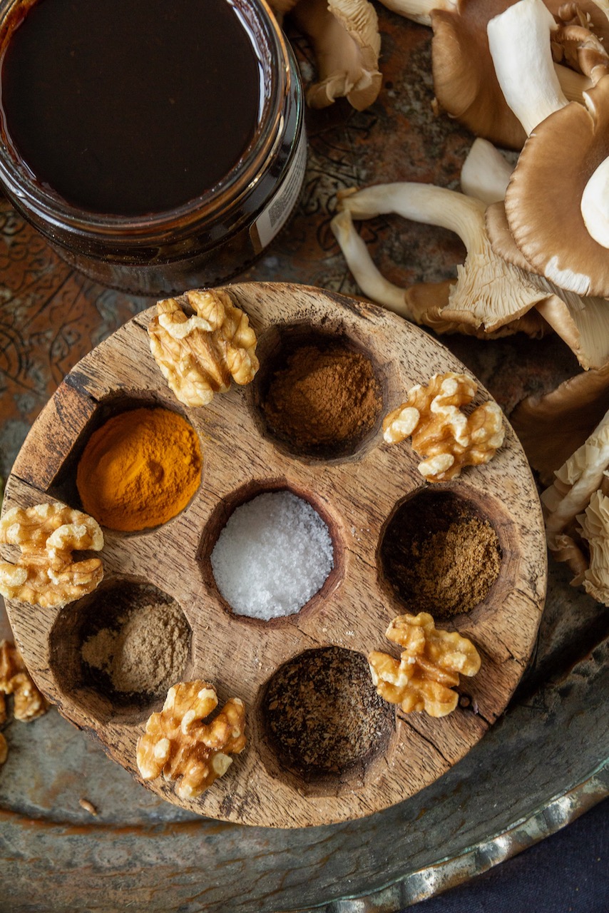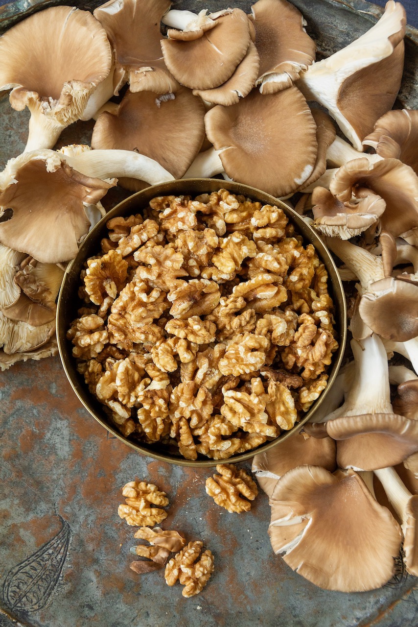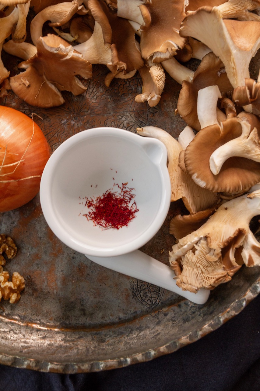 Sobald die Walnussoße fertig gekocht ist, die Austernpilze zubereiten. Die Zwiebeln würfeln und in Öl goldbraun anbraten. Wenn sie goldbraun sind, Kurkuma darüberstreuen und kurz wenden. Die Austernpilze hinzufügen, mit gemahlenem Safran bestreuen, die Lorbeerblätter darauflegen und rundherum anbraten.