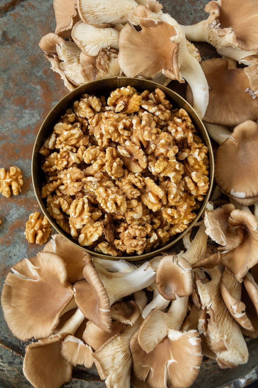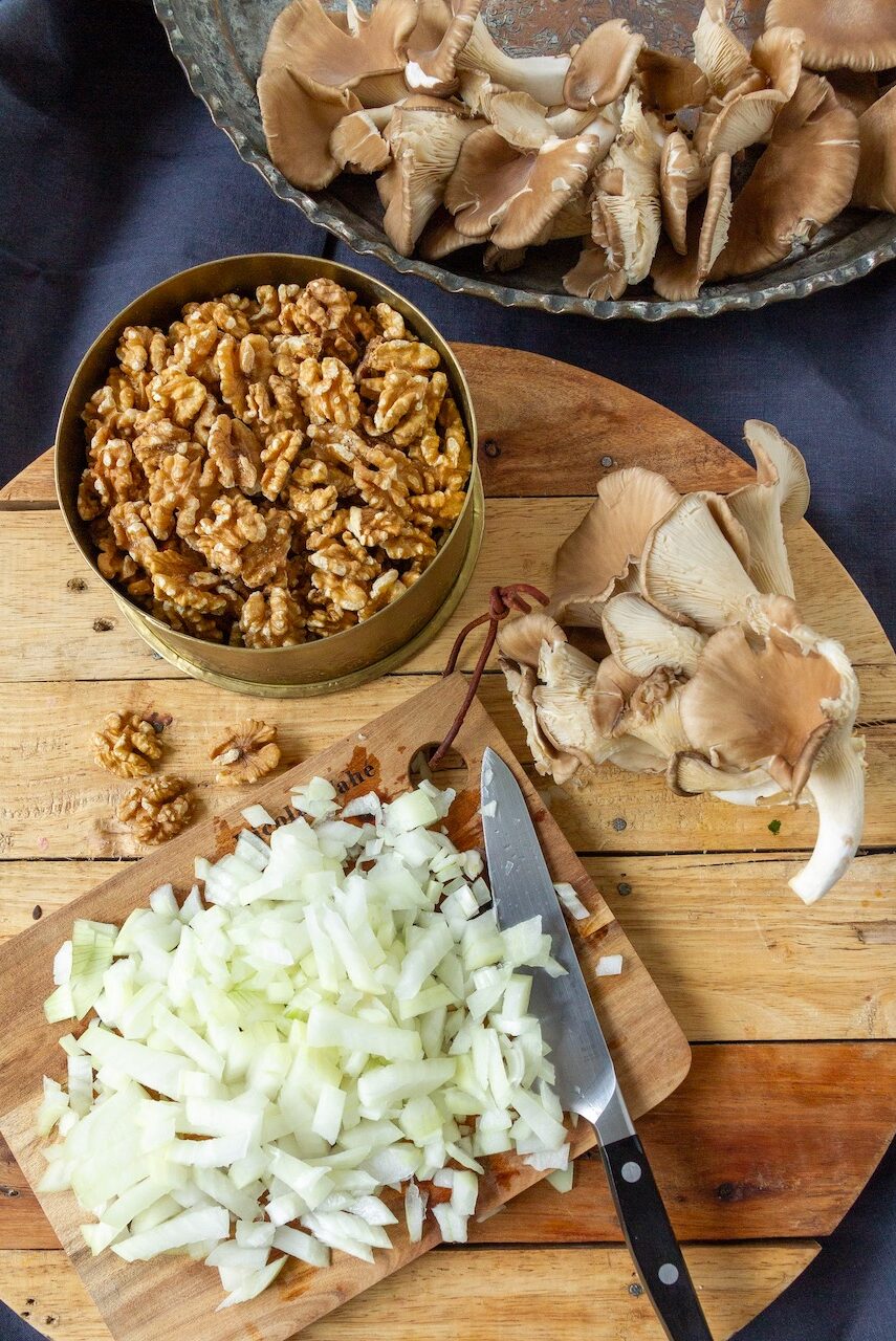 Sobald die Walnussoße fertig gekocht ist, die Austernpilze zubereiten.