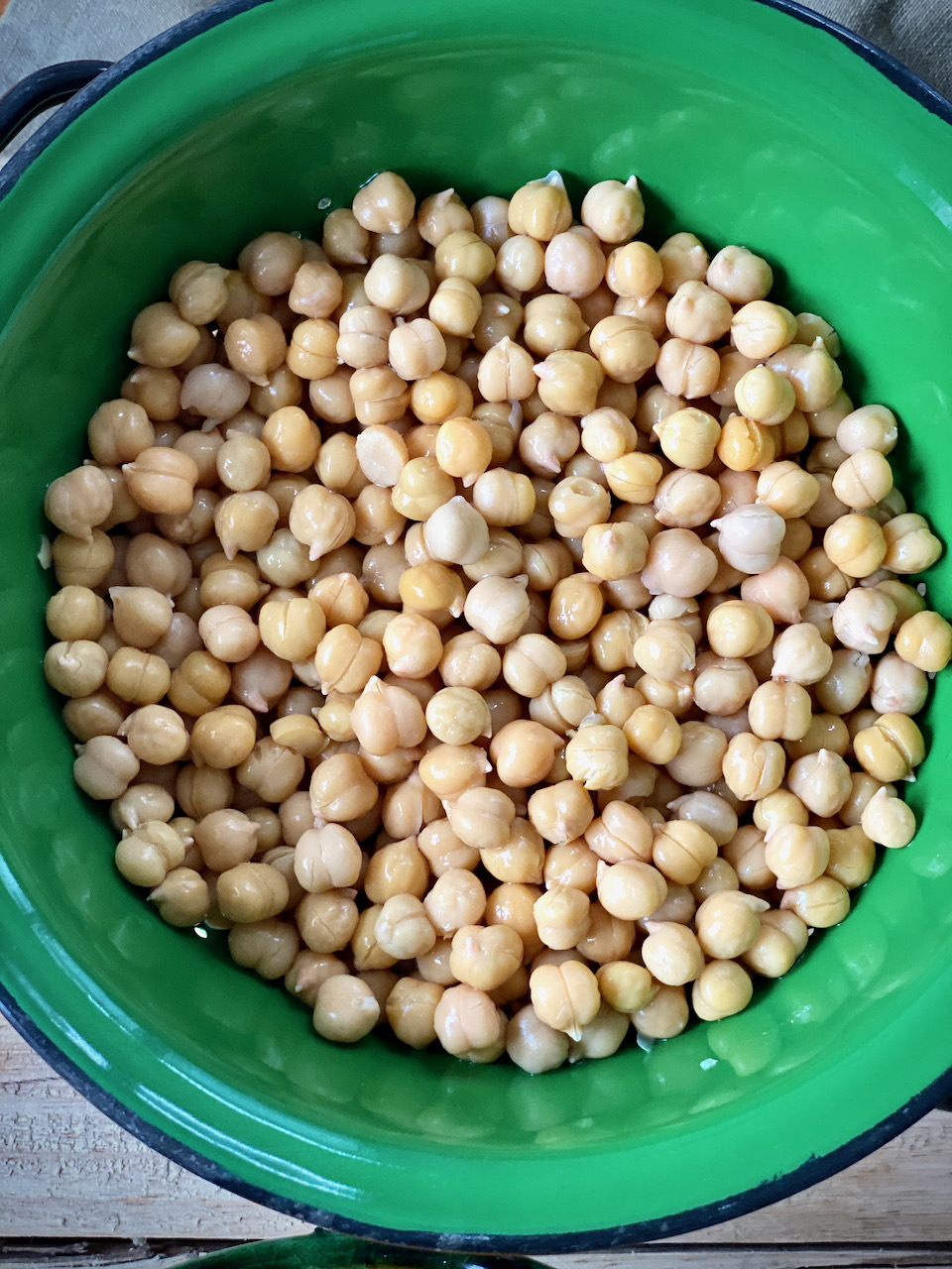 Manchmal gibt es ein Paar hartnäckige Kichererbsen darunter, die ihre Haut partout nicht hergeben wollen. Ritze diese mit dem Fingernagel ein wenig ein und lasse die Kichererbse zwischen Daumen und Zeigefinger durch die Haut flutschen. Gib die Kichererbsen zurück ins Wasser, siehst du wie die Schalen oben schwimmen und die schweren Kichererbsen zu Boden sinken? Jetzt schöpf mit der Hand die Schalen heraus und spüle die Kichererbsen unter klarem Wasser ab. Siehst du wie schön glatt und glänzend die Kichererbsen jetzt sind?
