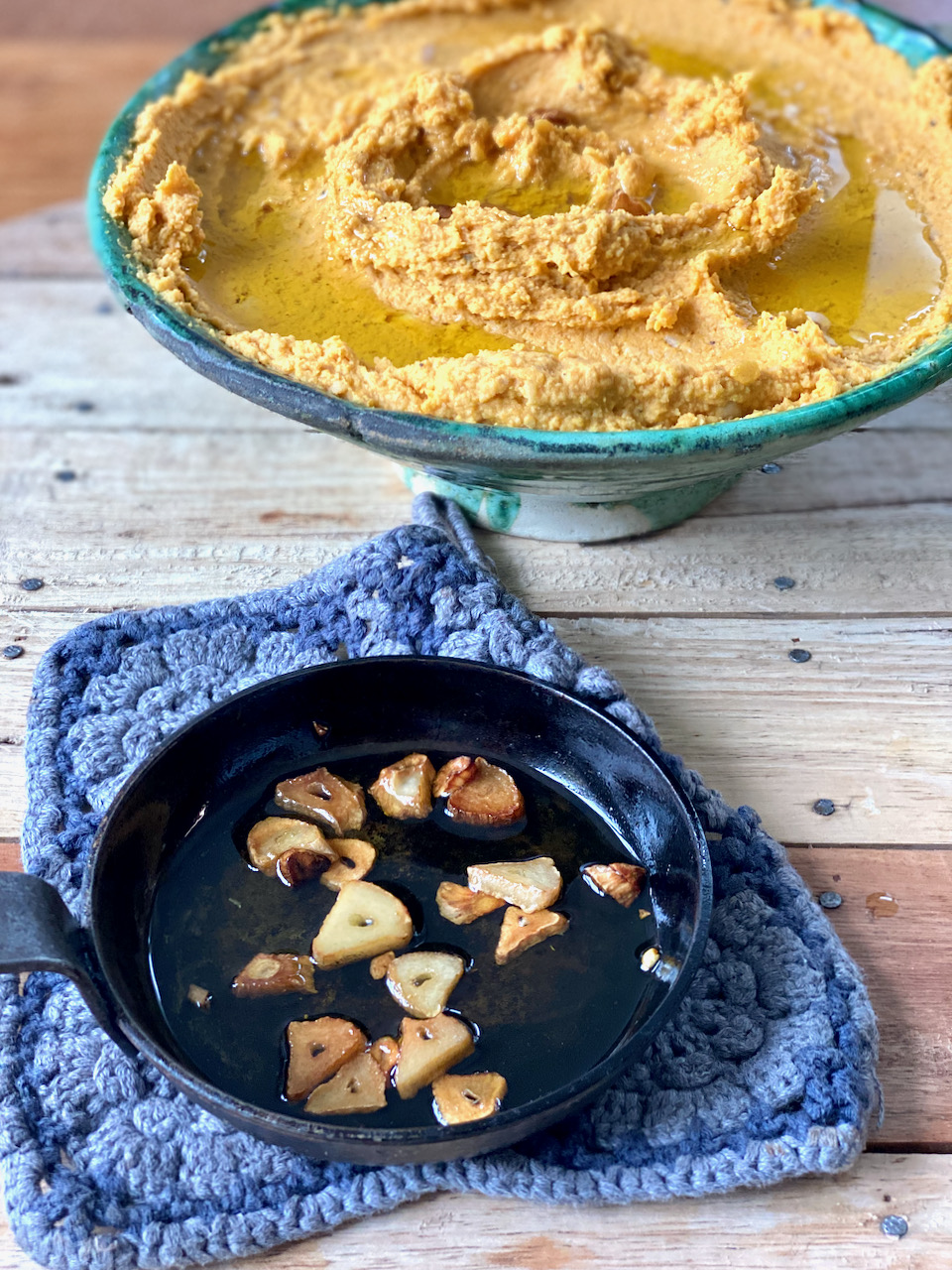 - 2 Knoblauchzehen für den Hummus nicht mit Kürbis pürieren
