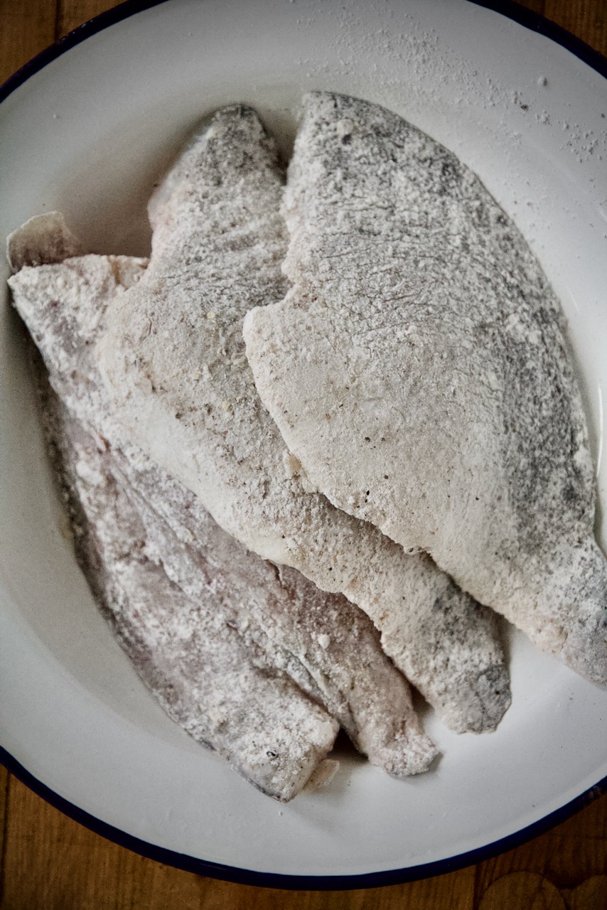 Doradenfilets aus der Marinade nehmen, gut abtupfen, in der Mehl-Gewürzmischung wälzen und in etwas Öl in der Pfanne für 5 Minuten anbraten.