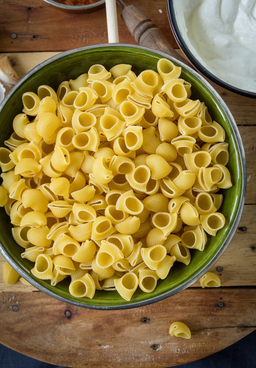 Für meine Manti für Faule – Türkische Pasta mit Hackfleisch verwende ich am liebsten türkische, gerillte Muschelnudeln, genauer gesagt Manti Lumachine Rigate, zum Beispiel von PIYALE since 1922. Diese Pasta ist wie gemacht für dieses Gericht. Die kleine Muschelform erinnert nicht zufällig an klassische Manti: Sie fängt die Sauce wunderbar ein. In den Vertiefungen sammelt sich der Joghurt, und auch die würzige Paprikabutter bleibt perfekt haften. Durch die gerillte Oberfläche verbindet sich außerdem alles noch besser mit dem Hackfleisch. Jeder Bissen ist dadurch besonders aromatisch.