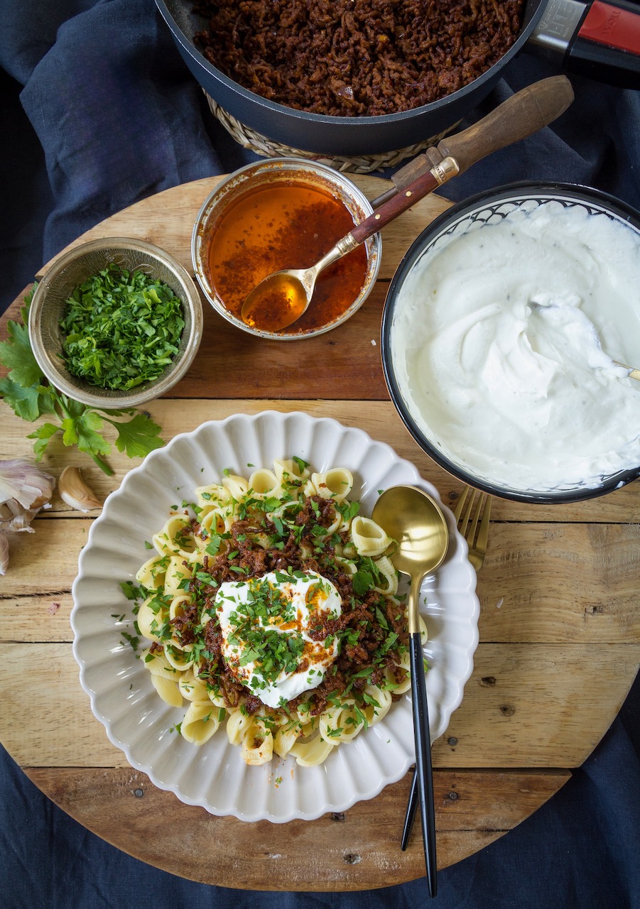 Diese türkische Pasta mit Hackfleisch ist im Grunde die unkomplizierte und neu interpretierte Antwort auf klassische Manti. Statt kleine Teigtaschen zu formen, wird Pasta verwendet. Der Rest bleibt vertraut: würziges Hackfleisch, Joghurt, Butter mit Paprika.