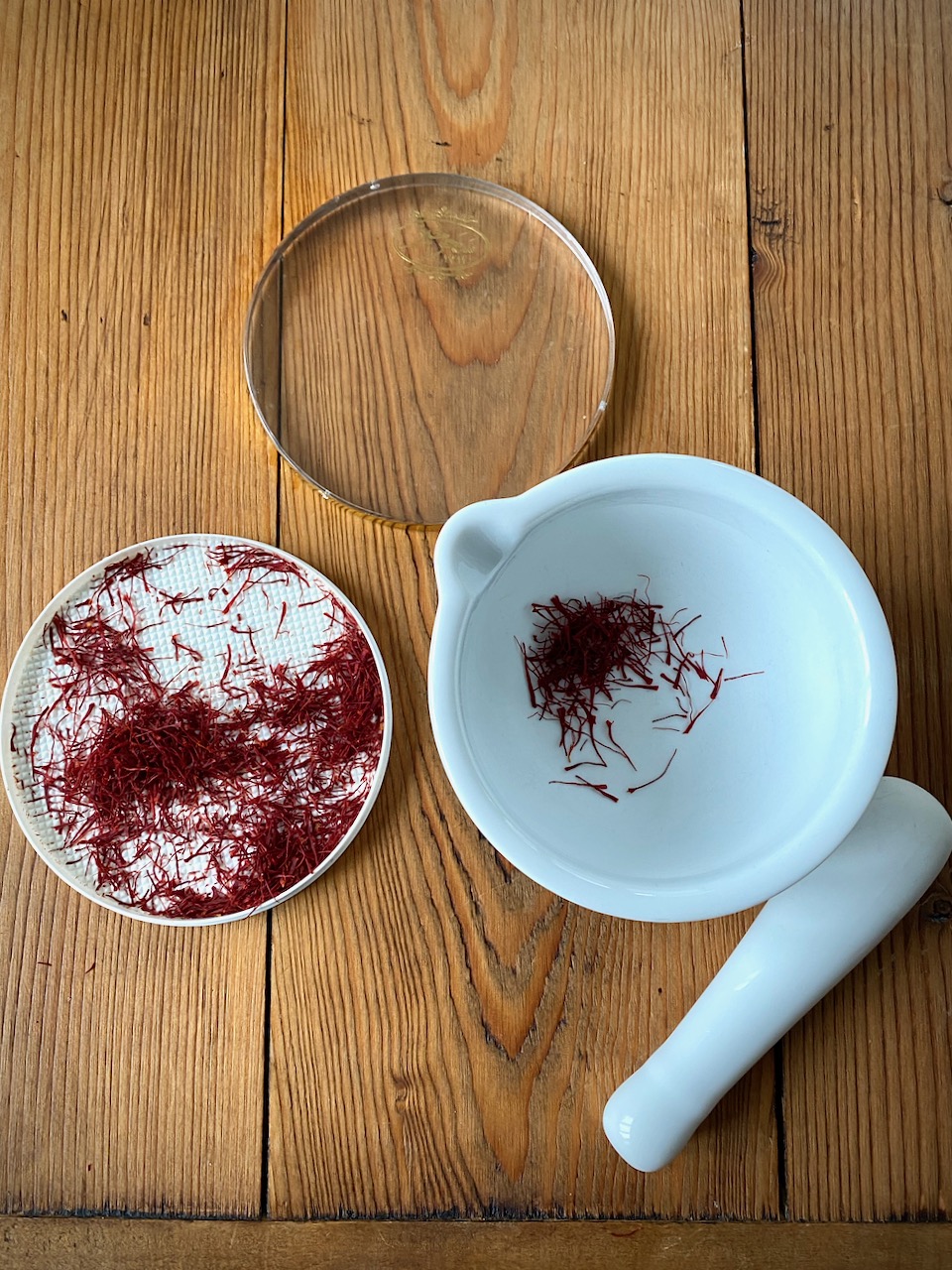 Safranfäden in einem Mörser fein mahlen und mit 25 ml kochendem Wasser übergießen. Mit einem Deckel zudecken und bis zum Gebrauch dämpfen lassen.