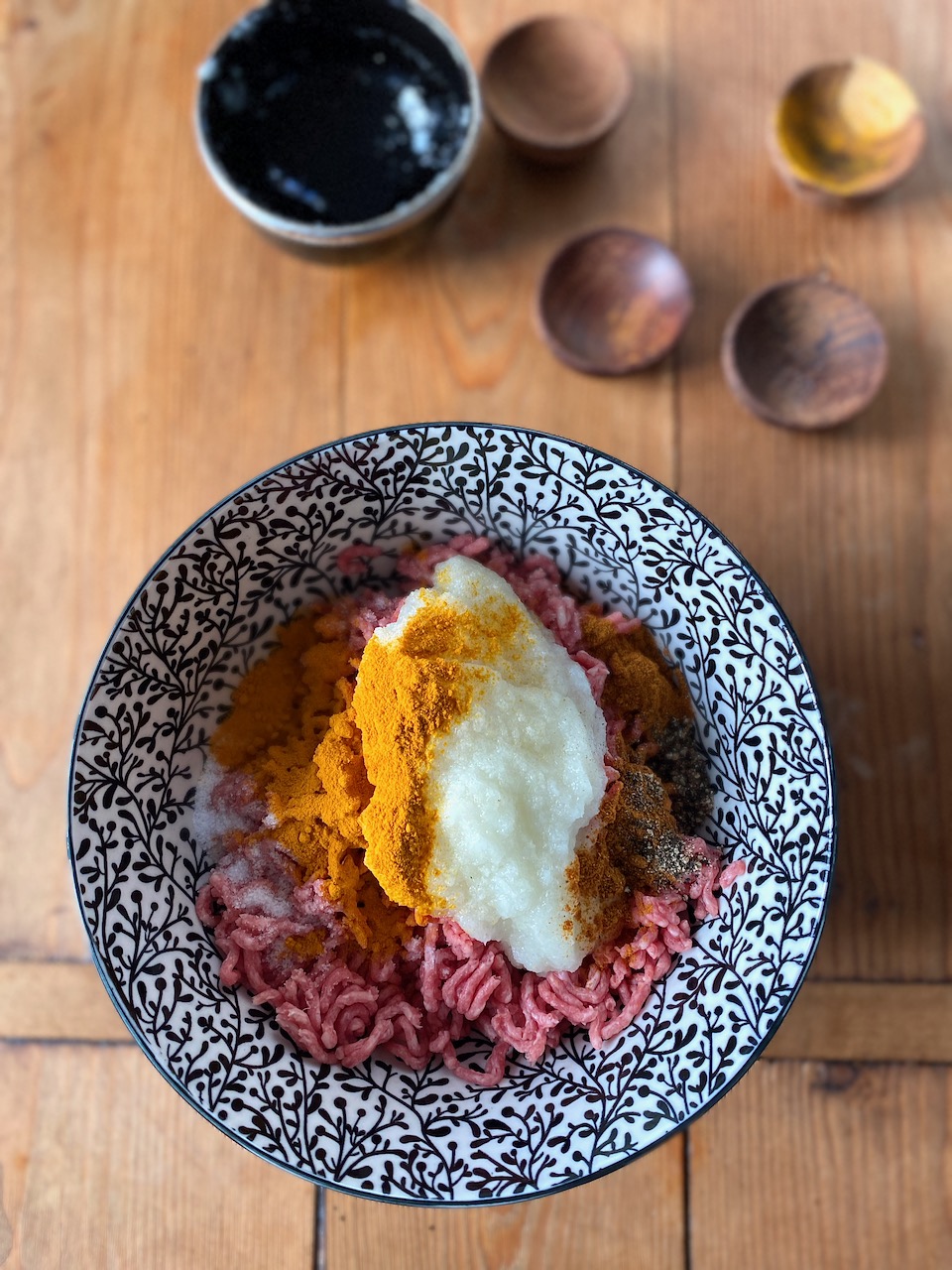 In der Zwischenzeit Zwiebel fein hacken und mit den Gewürzen unter Hackfleisch mischen.