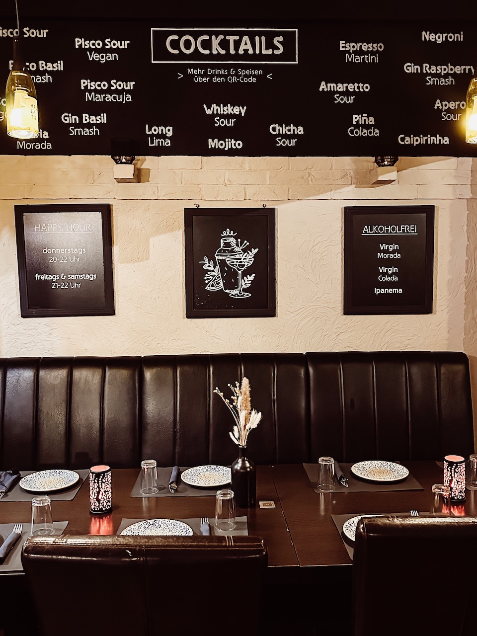 Poster und Fotografien, die die spanische und peruanische Kultur und Landschaften repräsentieren, schmücken die Wände. Wandtafeln an den Wänden zeigen eine Auswahl der verschieden angebotenen Getränke und Speisen. Viel Holz und Weiße Ziegelwände schaffen eine warme, freundliche und einladende Atmosphäre. Holzbalken an der Decke, dunkle Tische, Stühle aus Holz wirken rustikal und traditionell. Barhocker an der Theke ermöglichen es den Gästen, sich zu unterhalten und die leckeren Cocktails in Gesellschaft zu genießen. Eine warme, gedämpfte Beleuchtung trägt zur gemütlichen Atmosphäre bei. Hängelampen aus recycelten Weinflaschen mit der Aufschrift „Habla la Tierra“ sorgen für gedämpftes Licht, Kerzen und Blumen auf den Tischen für Gemütlichkeit.