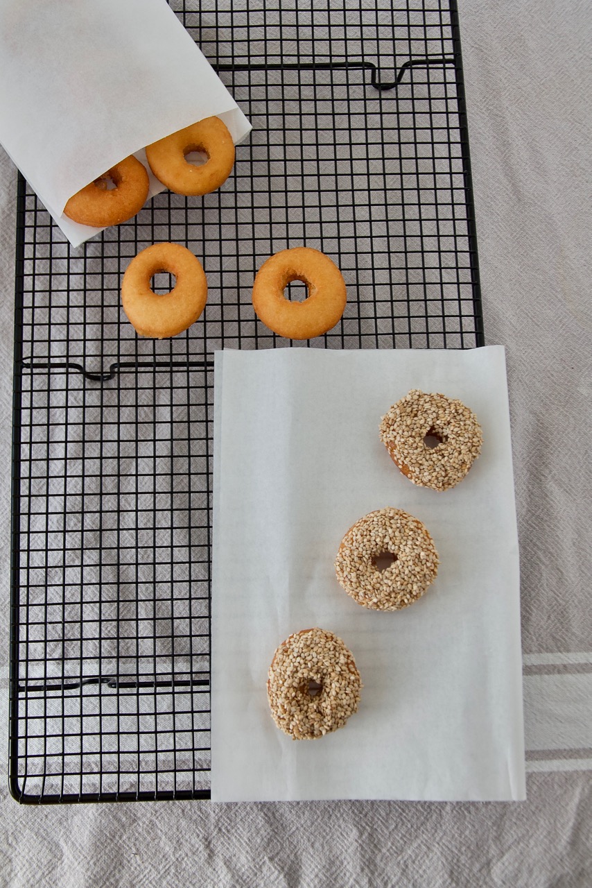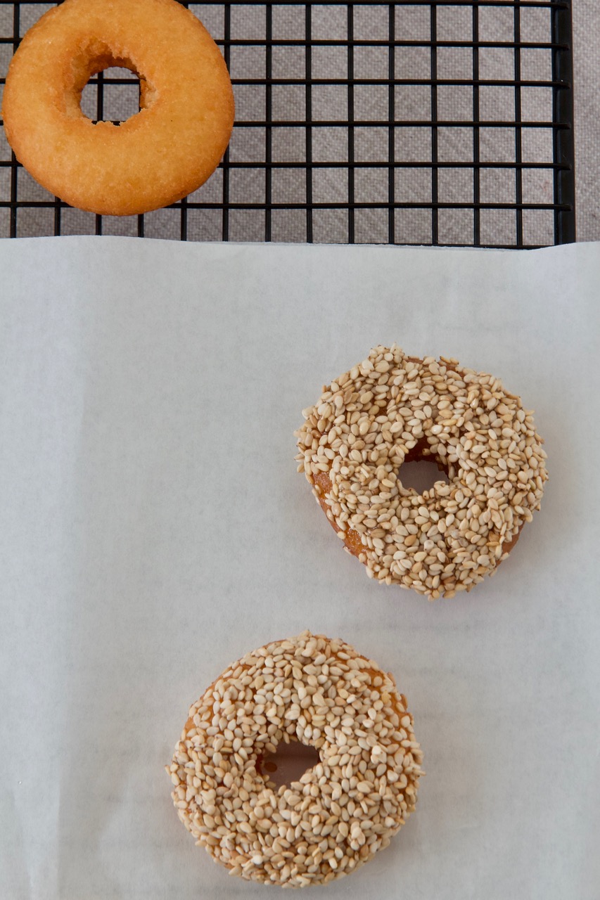 Einen Donut mit zwei Finger packen und kopfüber in Sesam drehen. Fertig!