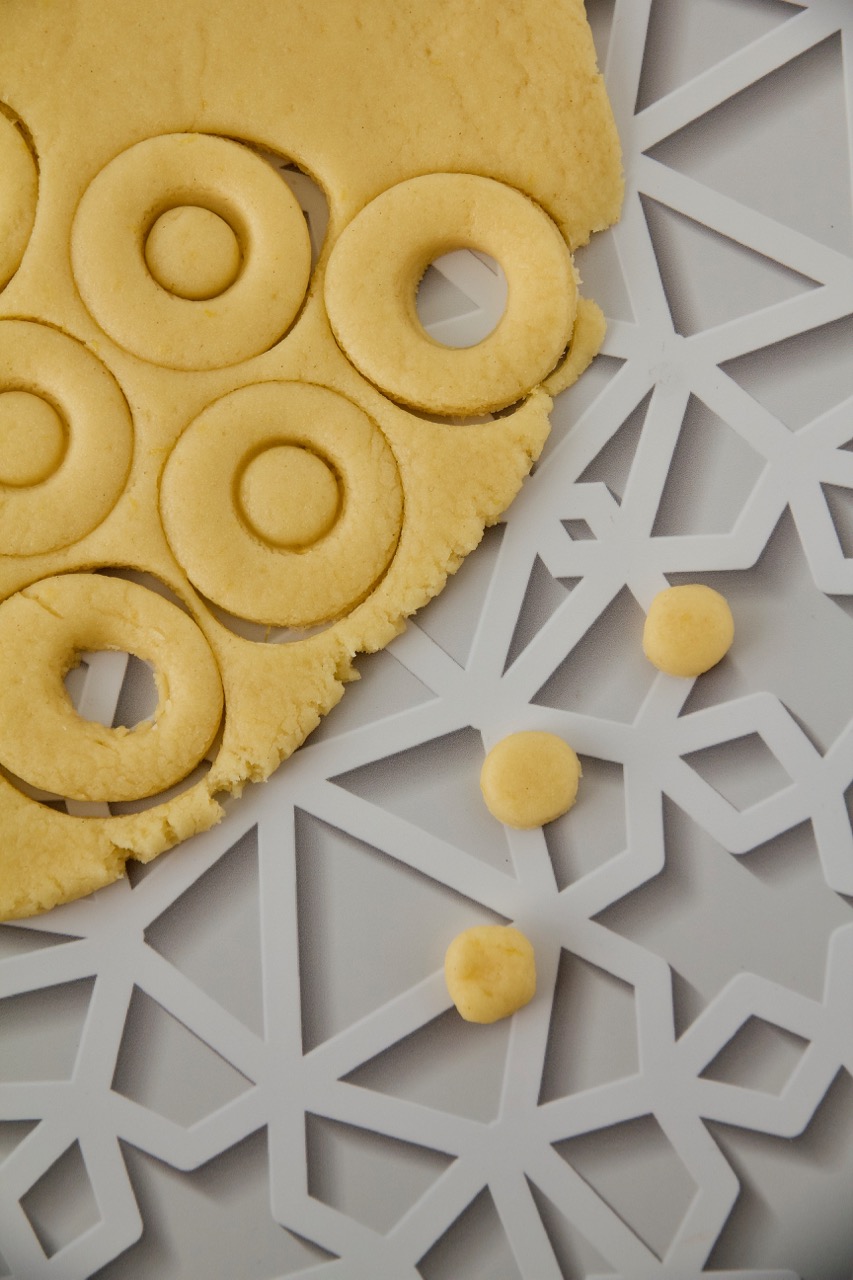 Hände mit Öl einreiben und den Teig ein paar mal durchkneten und ca. 1 cm dick ausrollen. Mit dem 5cm Ausstecher* runde Kreise ausstechen und mit einer kleineren Form 3,5 cm in der Mitte ein Loch ausstechen.