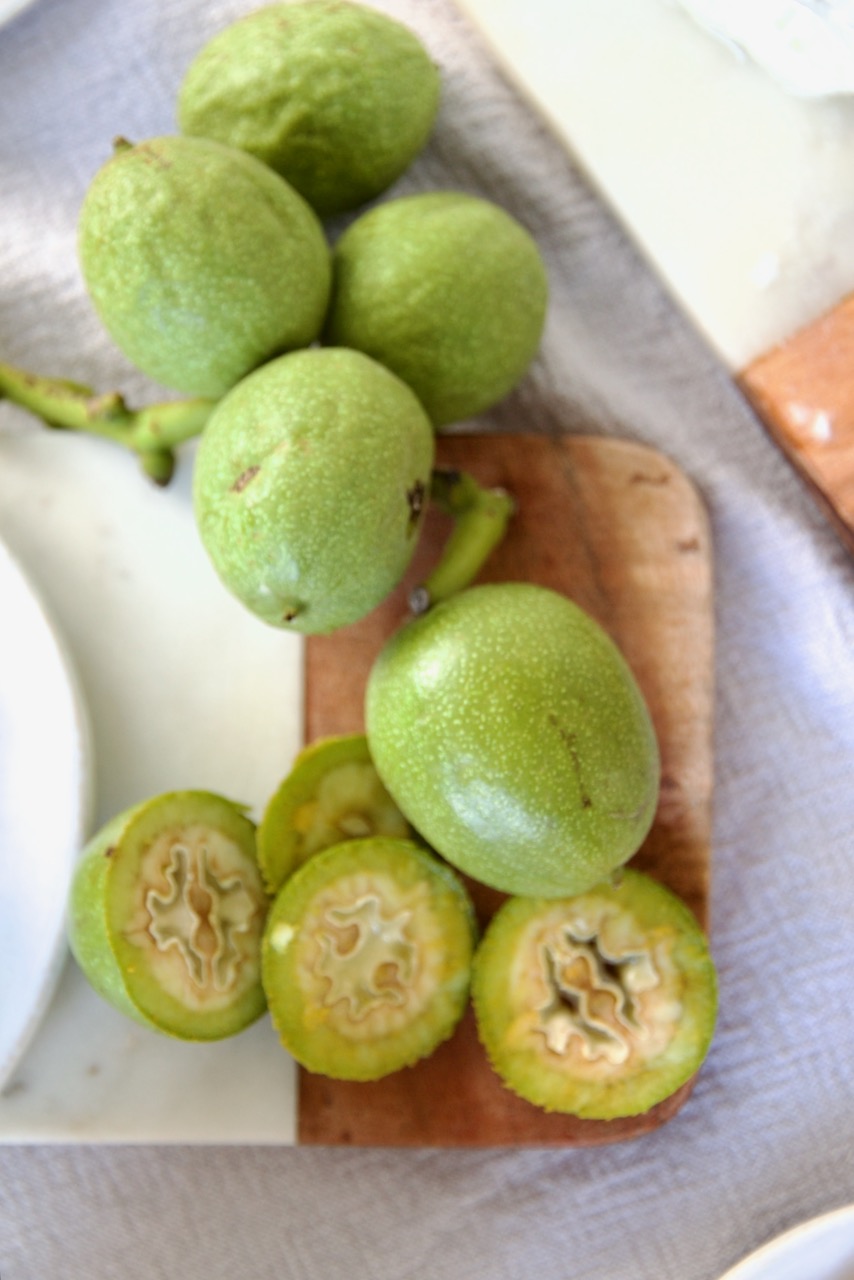 Schwarze Nüsse, dieser besonderer Gaumenschmaus wird aus unreifen grünen Walnüssen, die in der zweiten Junihälfte oder am Besten direkt zum Johannitag am 24. Juni geerntet werden. In dieser Zeit erreichen die Walnüsse die Milchreife, die Schale ist noch weich und es hat sich noch kein harter Kern gebildet. Meine unreifen grüne Walnüsse habe ich selber ganz frisch im Garten einer Freundin geerntet. Die Schale der unreifen Walnüsse sollten so weich sein, dass du sie leicht mit einer spitzen Nadel oder einem Zahnstocher durchstechen kannst. Falls es bei dir nicht mit dem Durchstechen klappen sollte, dann sind die Walnüsse schon zu reif und die innere Schale hat sich schon ausgebildet und ist verholzt.