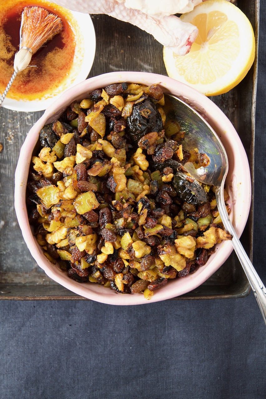 Morgh-e Shekam por – Persisches gefülltes Brathuhn aus dem Ofen wird durch die Füllung zu einem wahren Gaumenschmaus. Sie besteht aus Zwiebeln, Knoblauch, Trockenfrüchte wie Rosinen, Backpflaumen und Walnüssen. Das Geheimnis liegt in der besonderen Würze der Füllung und der Paprika-Marinade. Die Zutaten für die Füllung schmore ich zuerst in einer Pfanne und würze sie mit meinem Lieblingsgewürz Advieh – eine persische Gewürzmischung für Fleischgerichte und Kurkuma. Du kannst Advieh auch selbst aus folgenden Gewürzen zusammen mischen: 1 TL Damaszener Rosenblütenblätter*, 1 TL Ceylon Zimt*, 1 TL Kardamom*, 1 TL frisch gemahlener Pfeffer, 1/2 TL frisch geriebener Muskat*, 1/2 TL Kreuzkümmel*, 1/2 TL Koriander*, 1 TL getrocknetes Limettenpulver*.