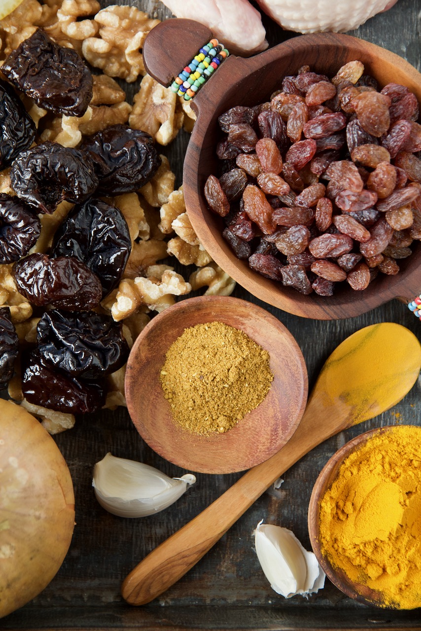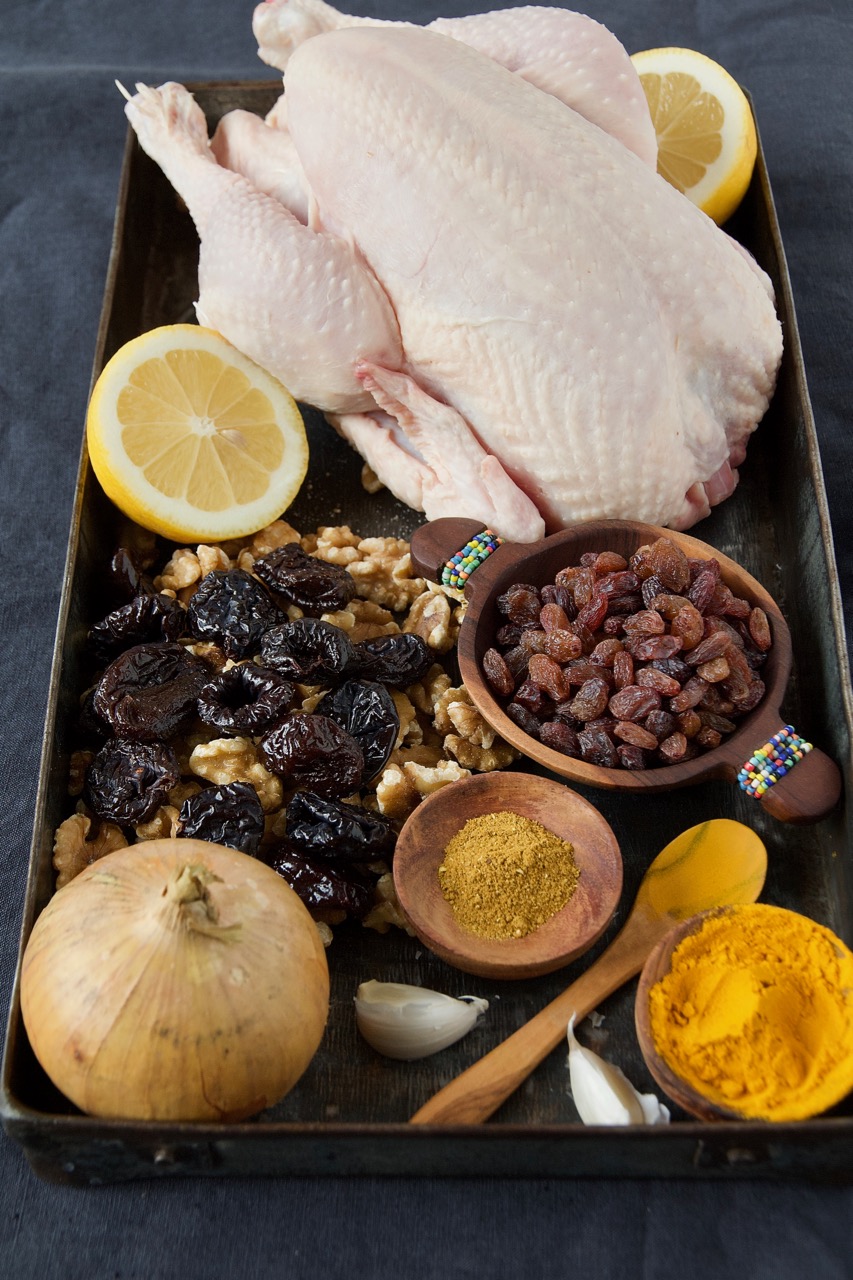 Wenn du magst, kannst du das Hühnchen für eine Stunde in eine Safran-Zitronen- Marinade einlegen, bevor du das Brathuhn füllst. Dafür 2 -4 Zitronen auspressen, 1 Zwiebel fein reiben und mit 1/2 TL gemahlenen Safranfäden, 3 EL Olivenöl, Salz und Pfeffer mischen. Das Hühnchen für 1 Stunde in der Marinade im Kühlschrank einlegen. Auch die Füllung kann sehr variieren, z. B. für Shab-e Yalda – Wintersonnenwende im Dezember füge ich statt Backpflaumen, Berberitzen, Granatapfel, Knoblauch, Kräuter, Safran und Granatapfelmark zu.