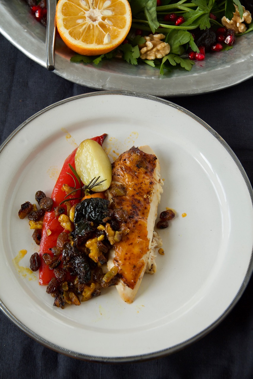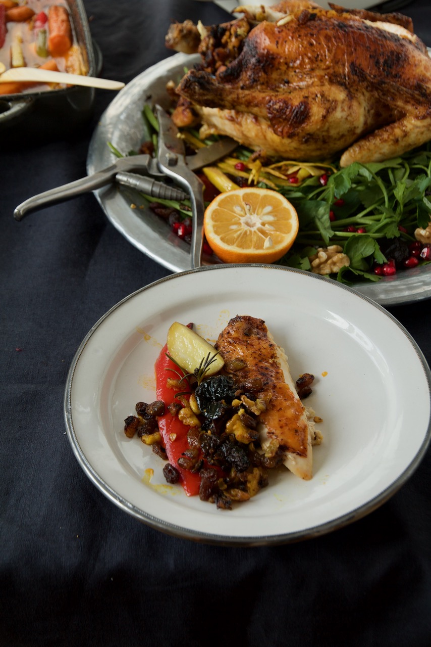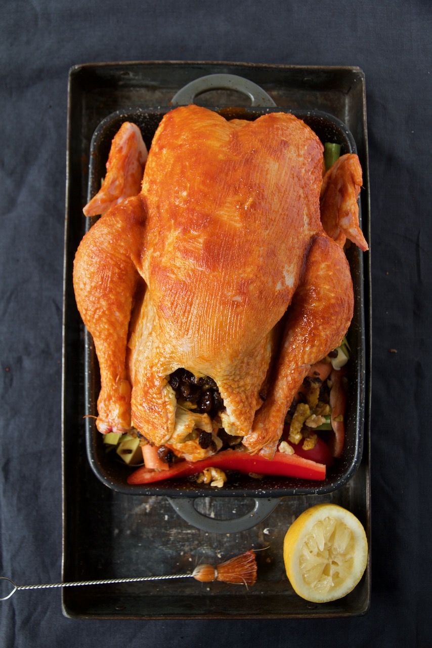 Das Brathuhn ist unfassbar lecker, leicht süß-sauer, außen knusprig und innen richtig schön saftig. Ich fülle das Brathuhn mit einer Trockenfrüchte-Nuss-Füllung und lege es auf buntes Gemüse in eine Form.