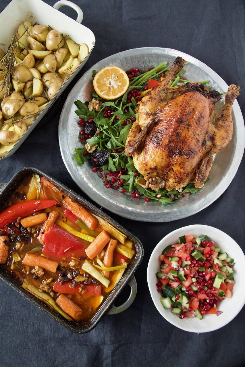 Anschließend das Brathuhn aus dem Ofen nehmen und mit einer Geflügelschere zerteilen. Die Brathuhnteile auf einem Teller anrichten und mit Rosmarin Kartoffeln, buntem Ofengemüse und Salad Shirazi servieren.