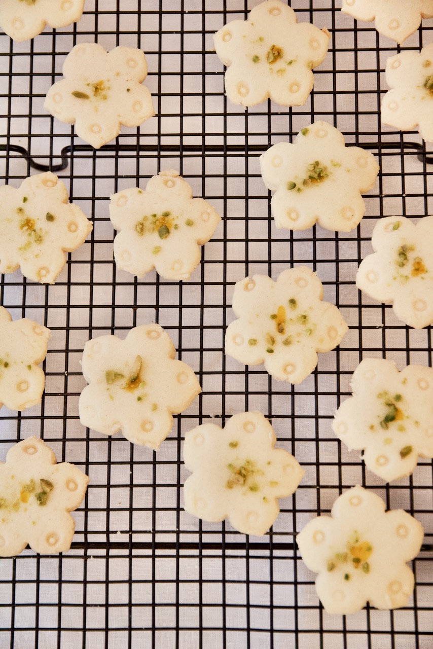 Using brewed saffron, place small dots on the center of the cookies and garnish with ground pistachios.