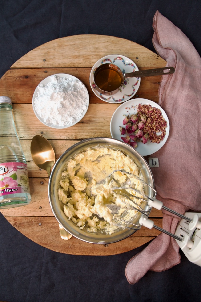 Butter cremig rühren, bis sie leicht und luftig ist. Puderzucker zufügen und unter rühren. Den Honig in zwei Etappen hinzufügen und gut verrühren. Rosenwasser esslöffelweise zugeben und weiterschlagen, bis die Masse glatt und cremig ist.