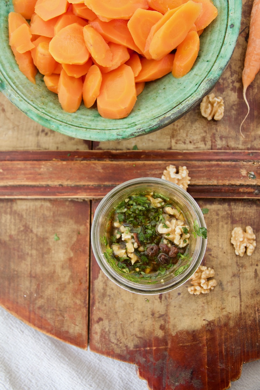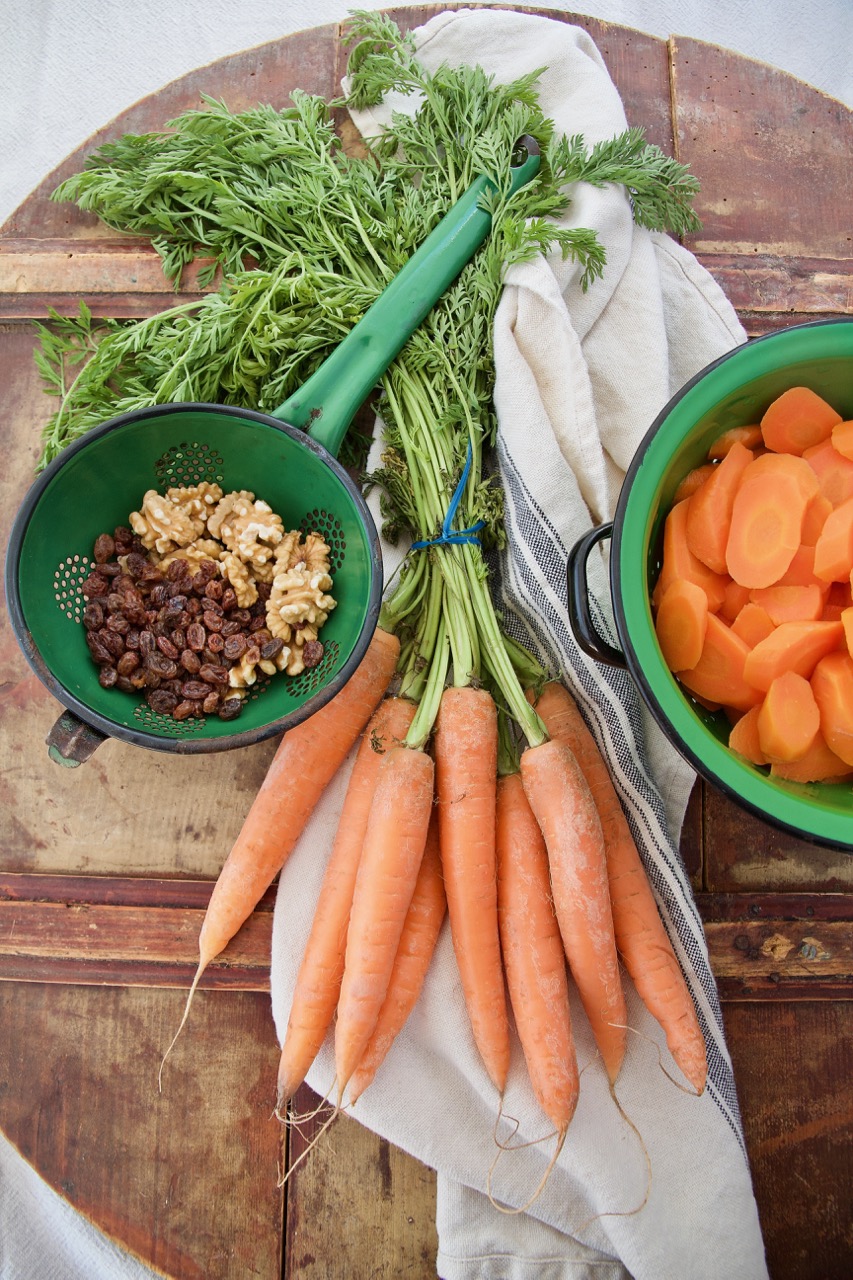 Rosinen waschen und in lauwarmes Wasser für 15 Minuten einweichen. In einem Sieb abgiessen und bereit stellen. Walnüsse ebenfalls waschen und in kaltem Wasser für 15 Minuten einweichen. In einem Sieb abgiessen, grob hacken und bereit stellen. In einem Topf Wasser mit 1 TL Salz zum Kochen bringen. Karotten schälen und in schräge Scheiben schneiden. Sobald das Wasser kocht, die Karotten zufügen und ca. 7 Minuten al dente kochen. In der Zwischenzeit eine Schüssel mit Eiswasser bereit stellen. Sobald sie al dente sind, mit einer Kelle herausnehmen und sofort in das Eiswasser geben. So erhalten die Karotten ihre schöne Farbe und garen nicht mehr weiter.