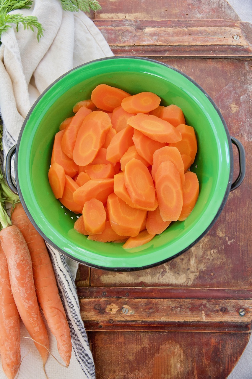 In einem Topf Wasser mit 1 TL Salz zum Kochen bringen. Karotten schälen und in schräge Scheiben schneiden. Sobald das Wasser kocht, die Karotten zufügen und ca. 7 Minuten al dente kochen. In der Zwischenzeit eine Schüssel mit Eiswasser bereit stellen. Sobald sie al dente sind, mit einer Kelle herausnehmen und sofort in das Eiswasser geben. So erhalten die Karotten ihre schöne Farbe und garen nicht mehr weiter.