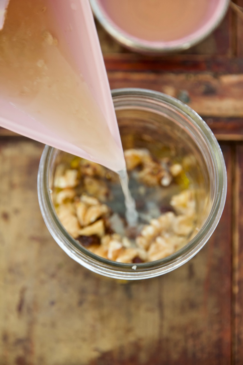 Walnüsse ebenfalls waschen und in kaltem Wasser für 15 Minuten einweichen. In einem Sieb abgiessen, grob hacken und bereit stellen.