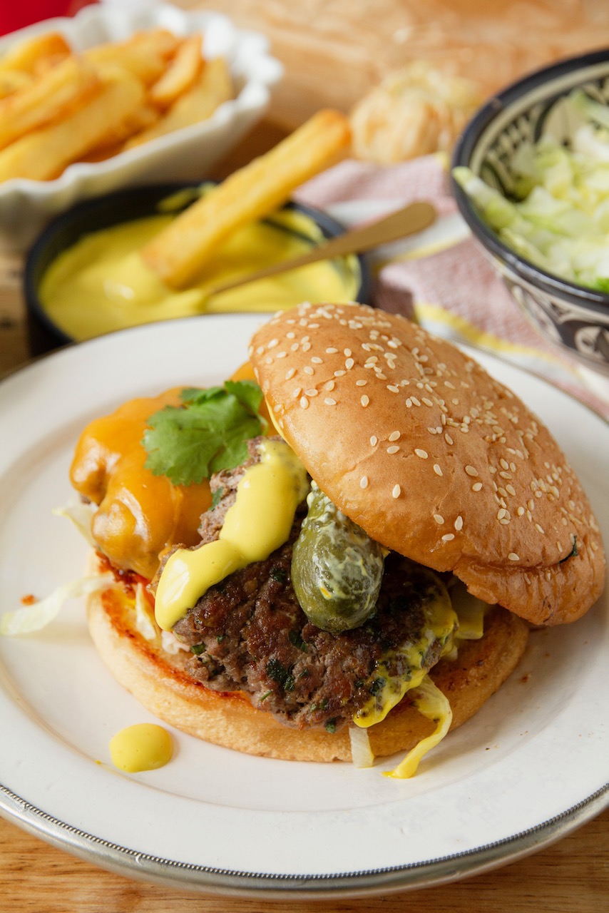 Wer hätte gedacht, dass ein Burger so viel Glamour ausstrahlen kann? Die dünnen, würzigen Patties sind außen perfekt geröstet und innen noch zart. Frischer Koriander, Sumach, Kreuzkümmel und Korianderpulver verleihen den orientalischen Touch in den Patties, während der Cheddar für den richtigen Schmelz sorgt. Die Patties sind eingebettet in knusprig gebratene Burger Buns und werden mit frischem Eisbergsalat, saftigen Tomatenscheiben und knackigen Salzgurken garniert. Dieser Turm aus Delikatessen wird durch die aromatische Safran-Aioli zu einem wahren Meisterwerk.