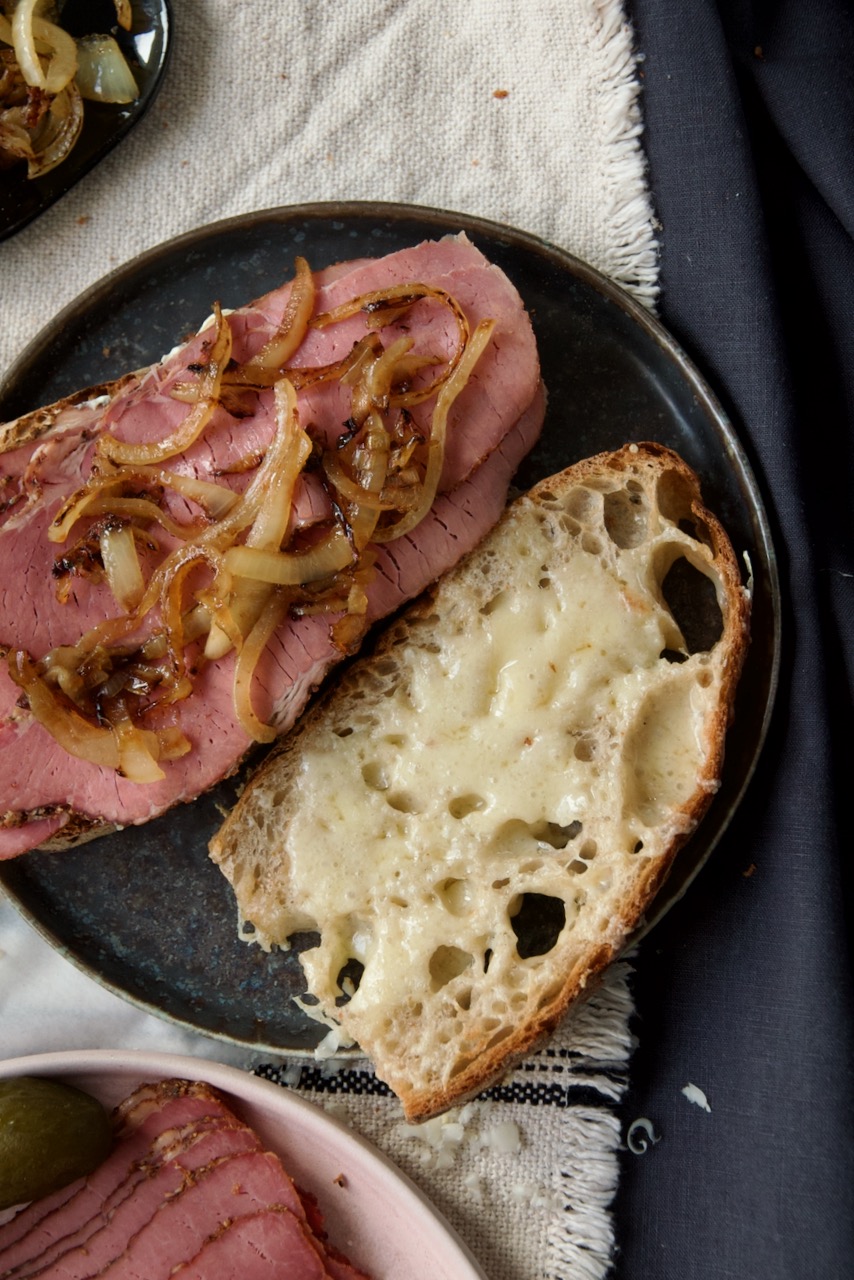 Auf die obere Hälfte die gerösteten Zwiebel verteilen und alle Brotscheiben aufeinanderlegen.