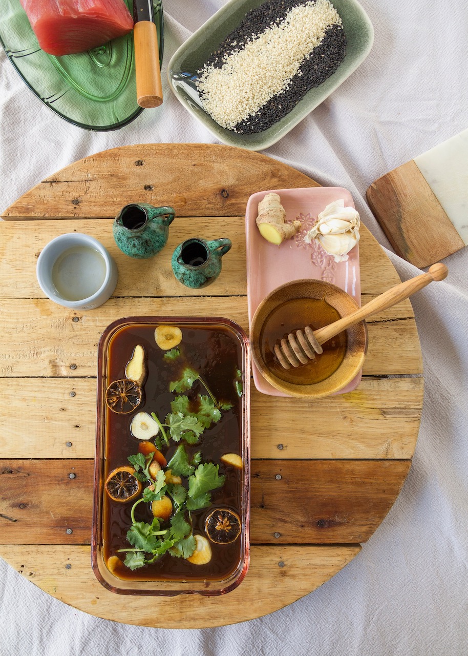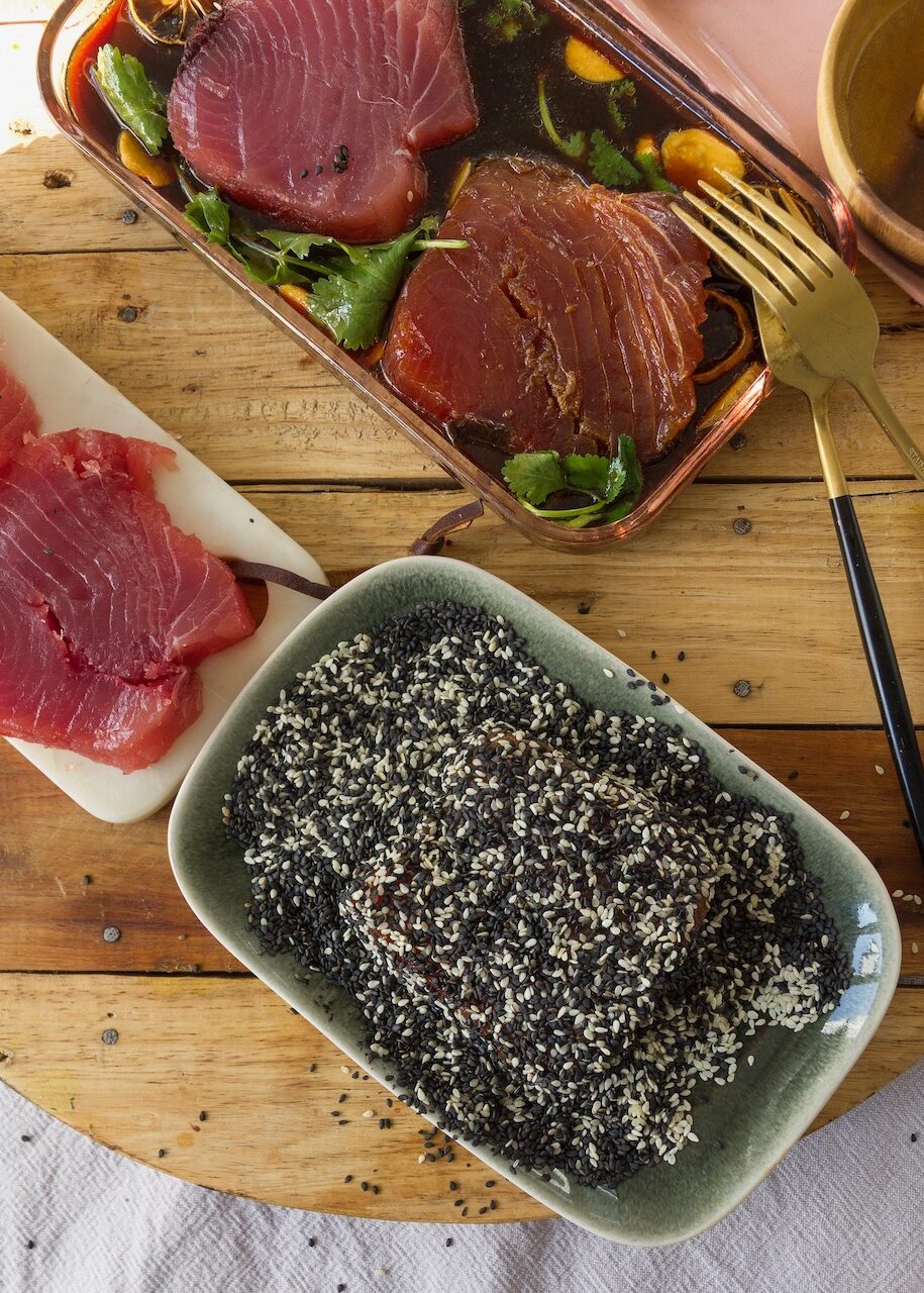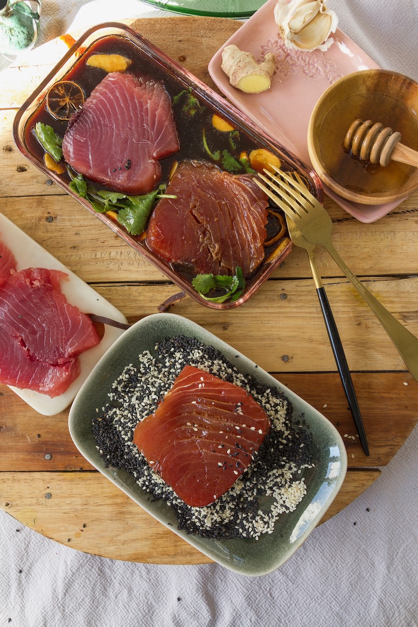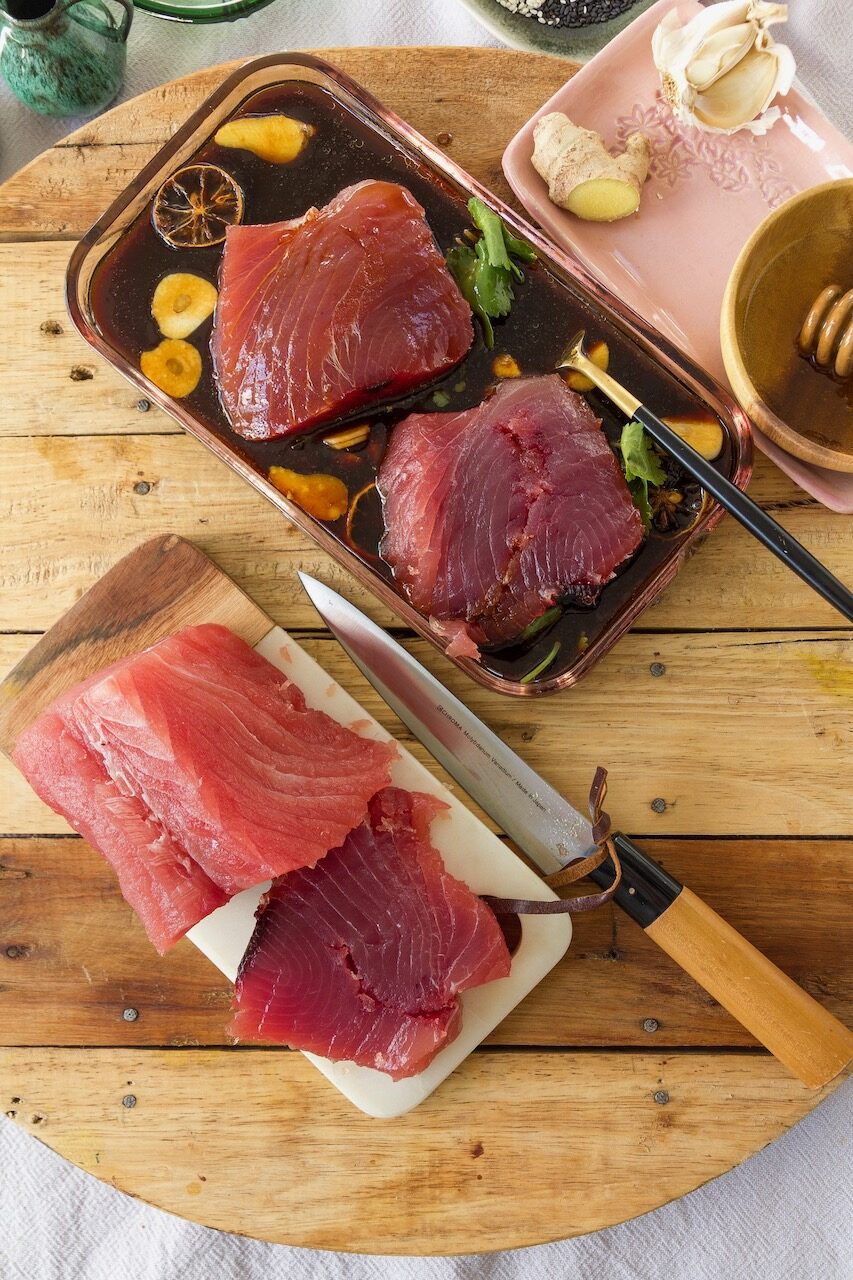 Mische alle Zutaten für die Marinade und lege die Thunfischfilets für 15 Minuten hinein. Wende sie zwischendurch, damit sie das Aroma rundum aufnehmen.