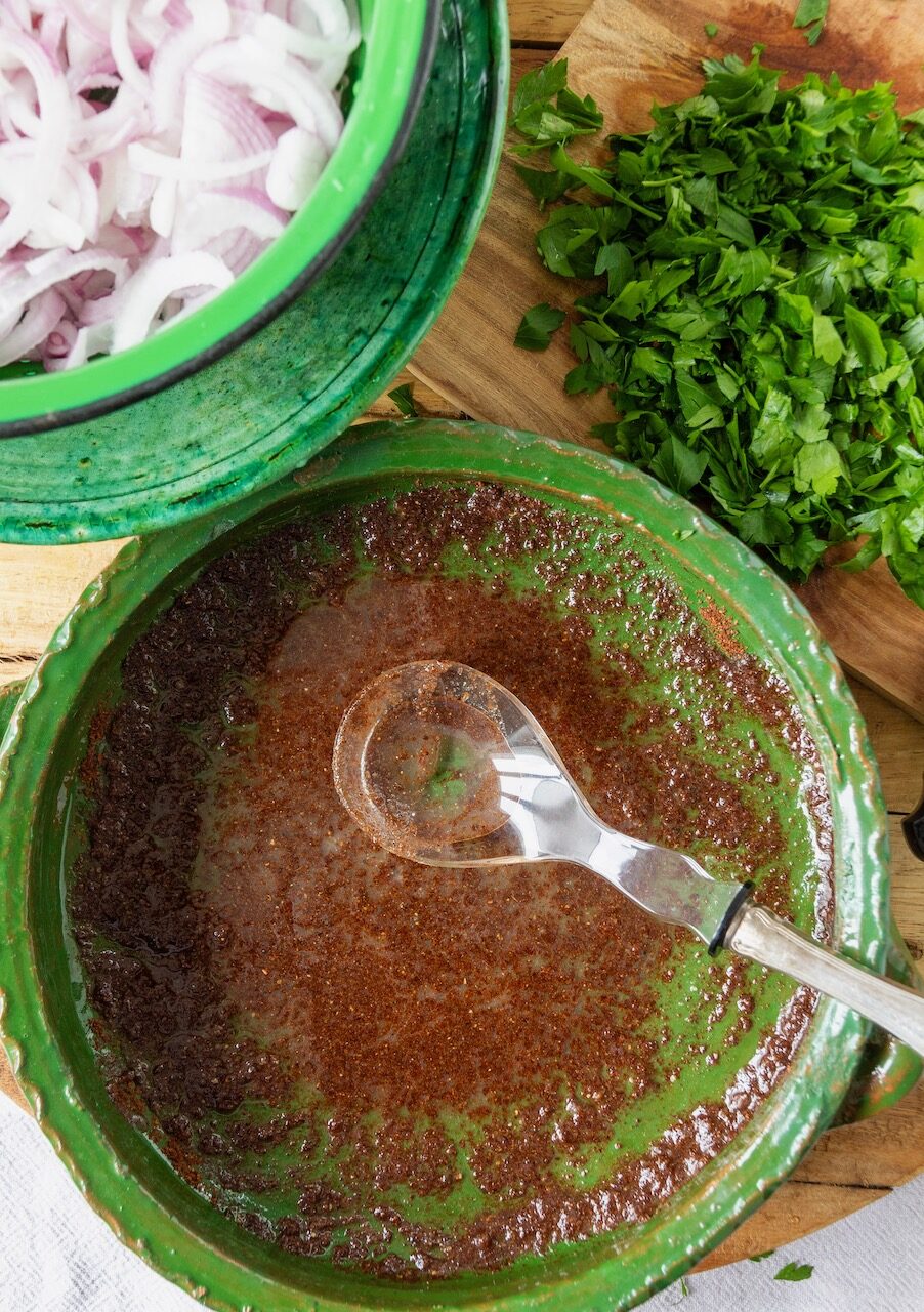 In eine Schale Olivenöl, Saft der Zitrone, Sumach, Salz und Pfeffer gut mischen.