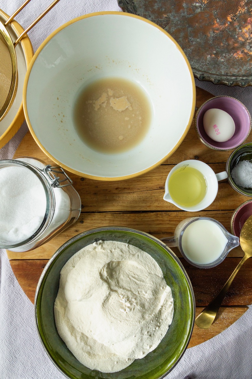 In der Zwischenzeit die Milch leicht erwärmen. In eine große Schüssel, die lauwarme Milch, den Vorteig und alle weiteren Zutaten bis auf das Mehl hineingeben und gut verrühren. Das Mehl nach und nach dazu sieben und etwa 10 Minuten kneten bis ein geschmeidiger Teig entsteht. Anschließend in eine geölte Schüssel legen, abdecken und etwa 1 – 2 Stunden an einem warmen Ort ruhen lassen bis der Teig sich verdoppelt.