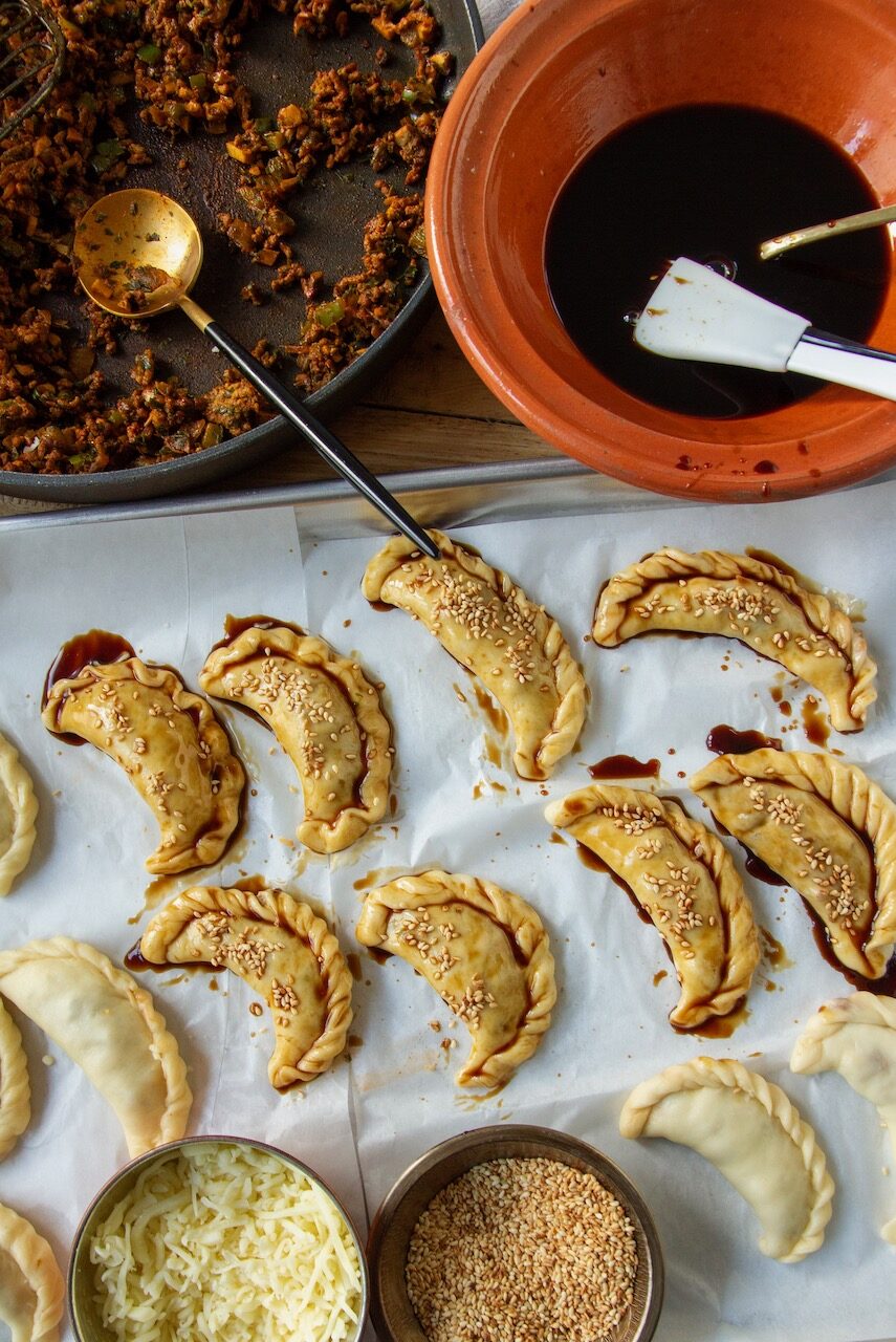 Teig nach dem Ruhen noch einmal kneten und teilen. Ein Teil ausrollen und mit einem Glas oder einer Form Kreise ausschneiden. Jeden Kreis mit ein Esslöffel von der Füllung füllen und zusammenklappen. Die Ränder nach Belieben formen. Entweder die Seiten mit einer Gabel fest eindrücken oder mit der Hand gut zusammendrücken. Ich habe die Seiten kunstvoll eingeschlagen, siehe mein Video oder Fotos. Alle gefüllten Teigtaschen abdecken und für weitere 20 Minuten ruhen lassen.
