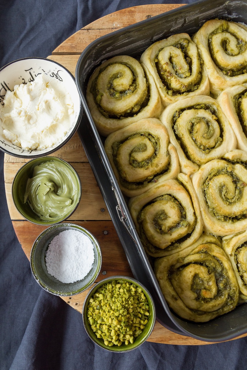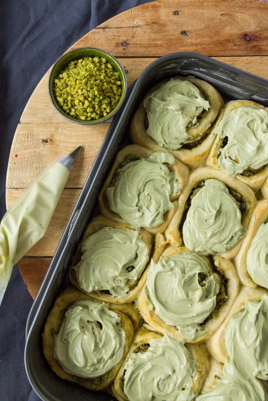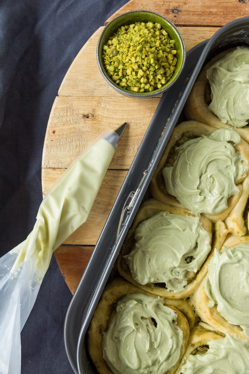 Teig ausrollen und mit Pistaziencreme (1 EL für das Frosting zur Seite stellen) bestreichen. Gehackte Pistazien darüber streuen und den Teig von der langen Seite aufrollen. Die Rolle mit einem Messer oder einem Garn in 12 gleich große Stücke schneiden und mit der Schnittkante nach oben in die eingefettete Form platzieren.