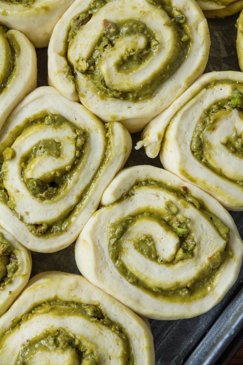 Teig ausrollen und mit Pistaziencreme (1 EL für das Frosting zur Seite stellen) bestreichen.