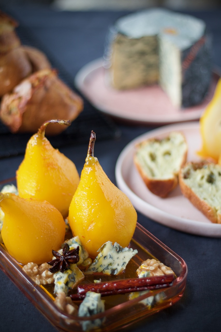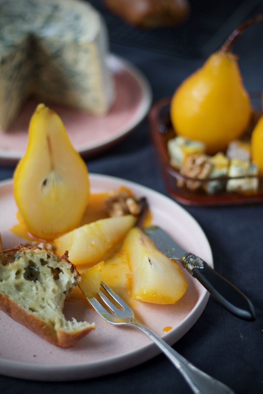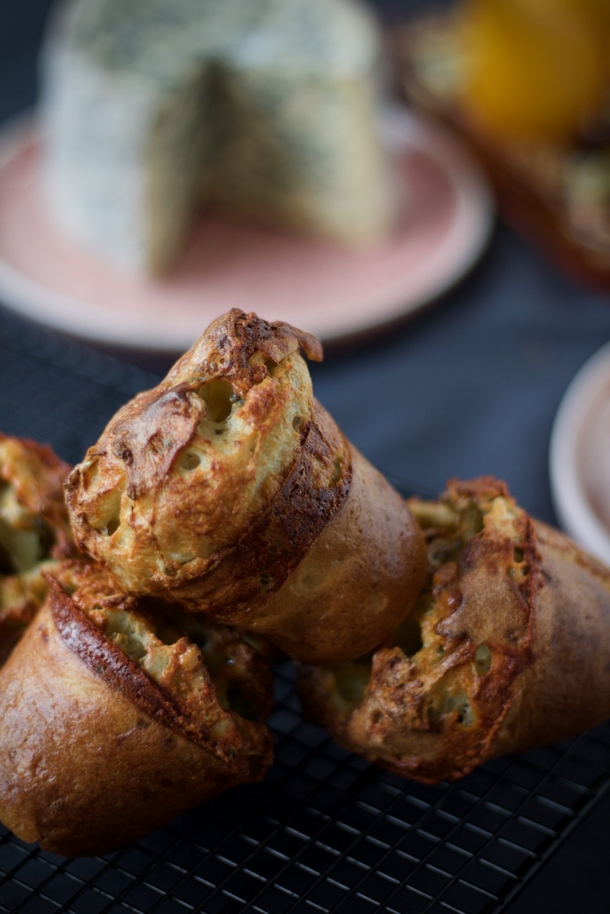 Popovers with Fourme d'Ambert and saffron cardamom pears