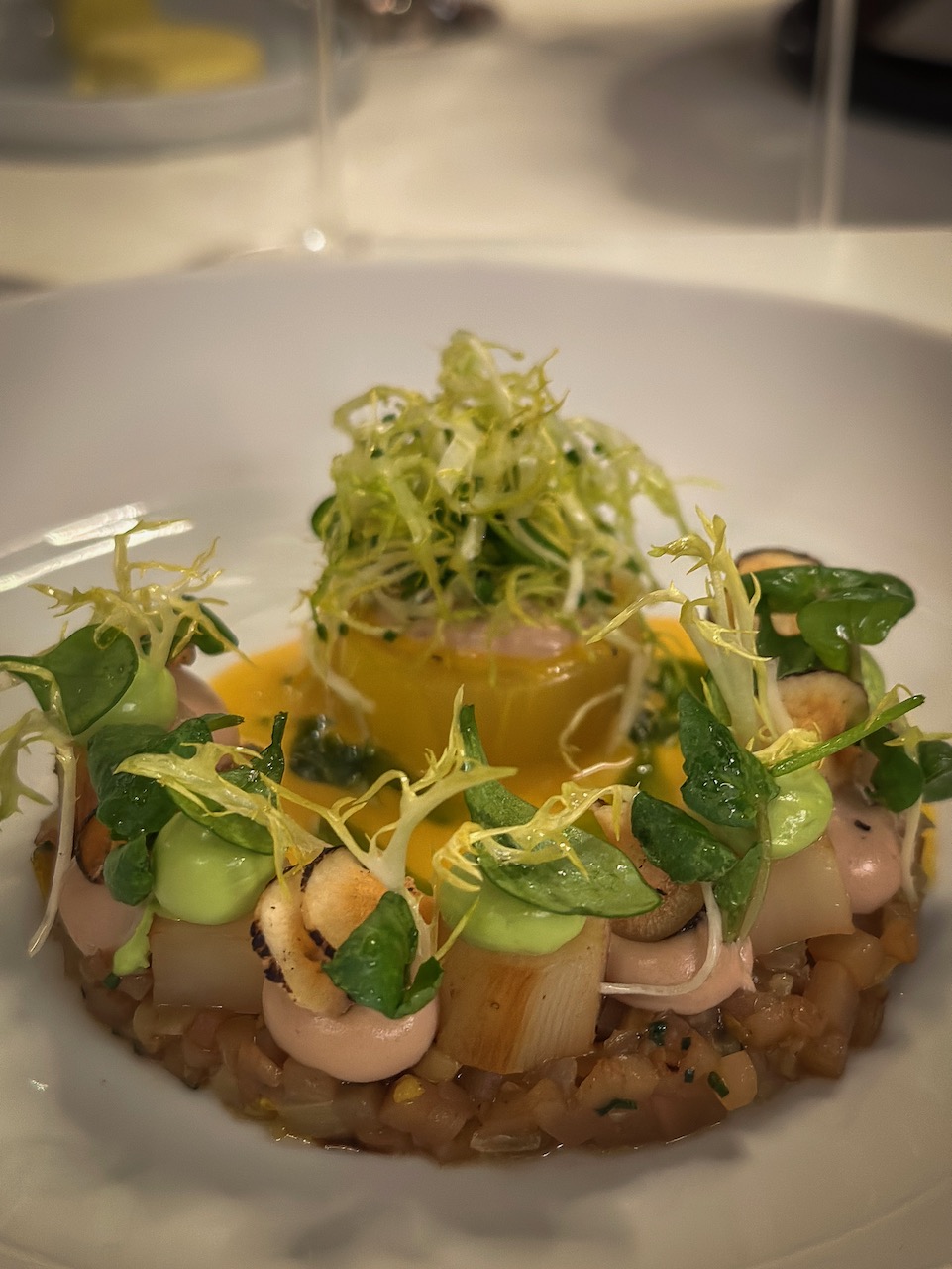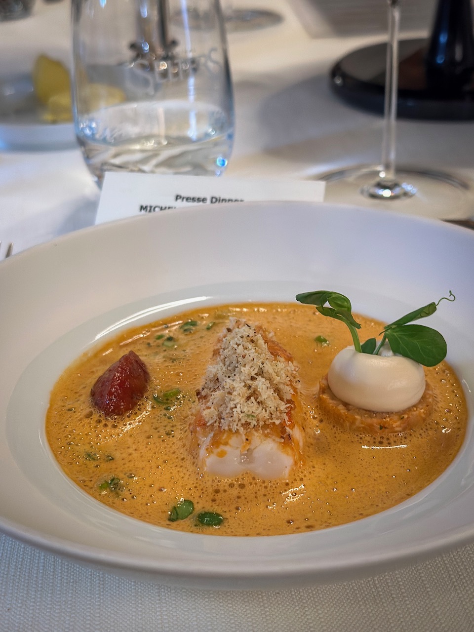 Danach folgte ein zart gebratener norwegischer Kaisergranat mit Macadamia, einer Krustentierbisque mit Kaffirlimette, zweierlei Blumenkohl, Erbsen und einem süß-würzigen Paprikachutney.
