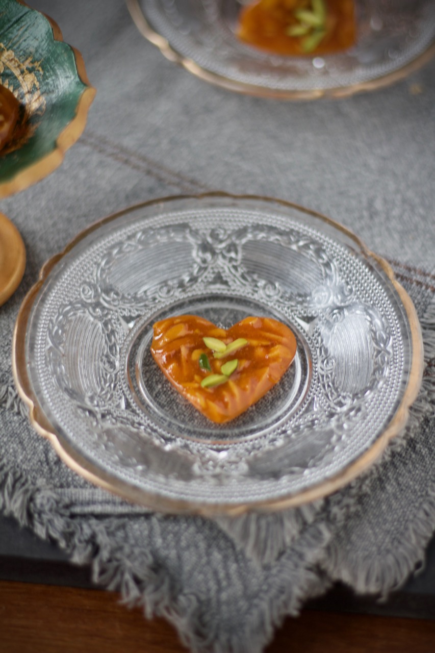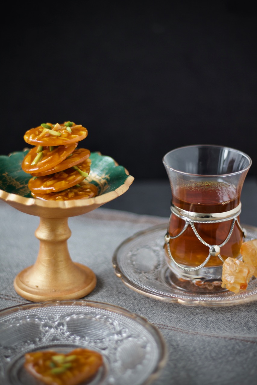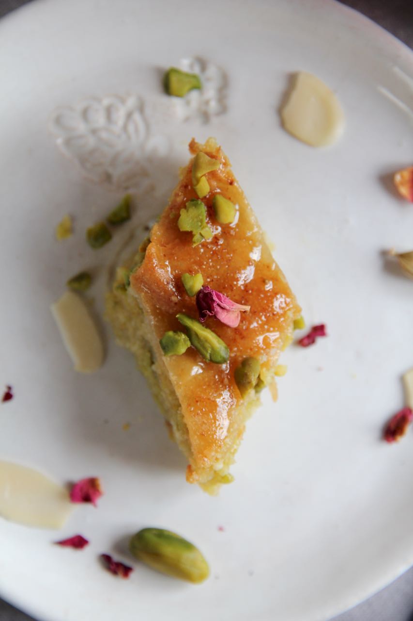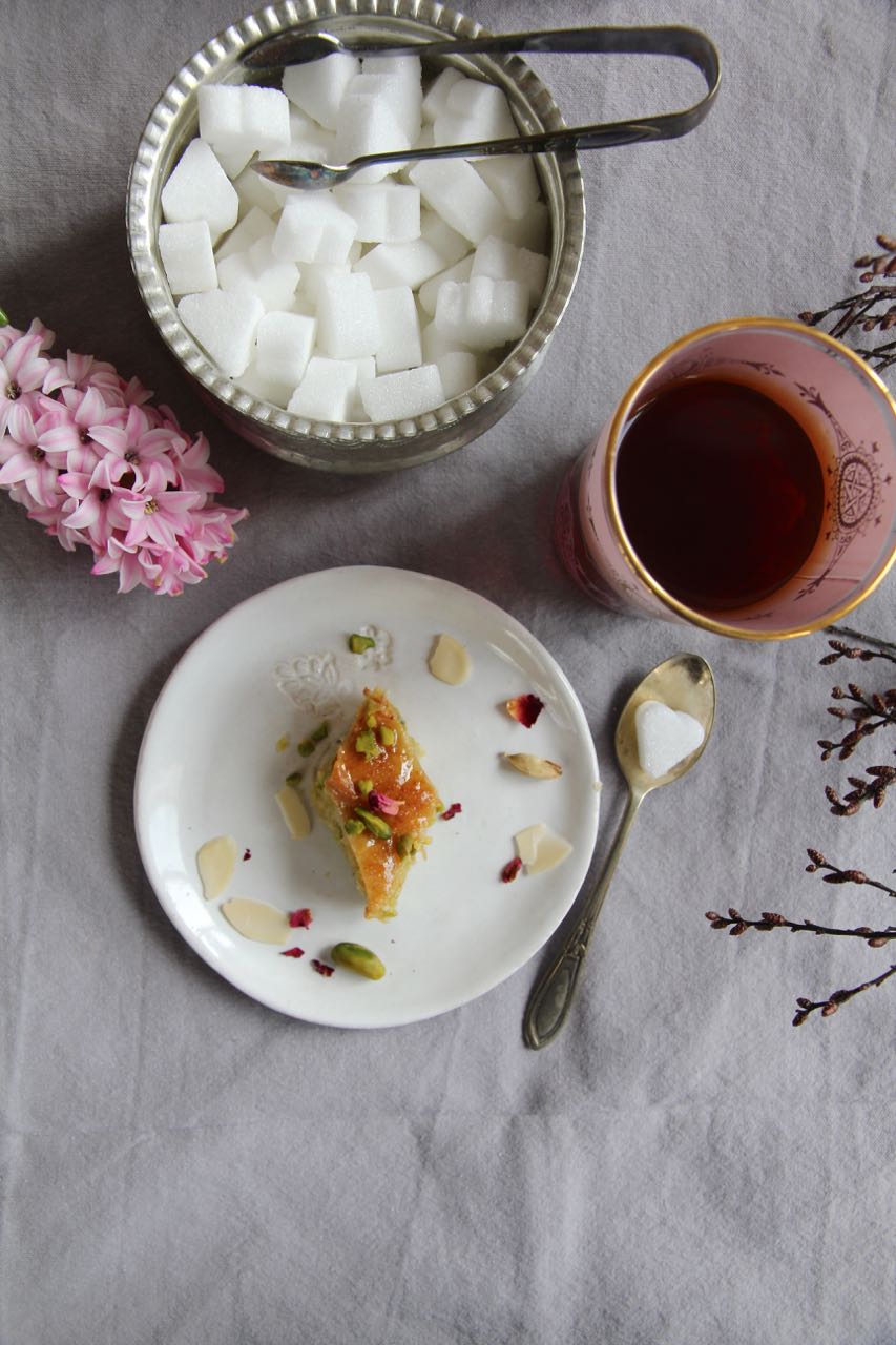 Ich habe Baghlava in einer runden Form vorbereitet und es in Diamantenmuster geschnitten, es ist wirklich ganz einfach. Yufka oder Filoteig werden mit Orangenblütenwasser, Kardamom, Zimt, Mandeln und Pistazien gefüllt. Anschliessend in Orangen-Zitronen-Zuckersirup getränkt, ergibt Baghlava eine süße Köstlichkeit mit einer fruchtigen Note.