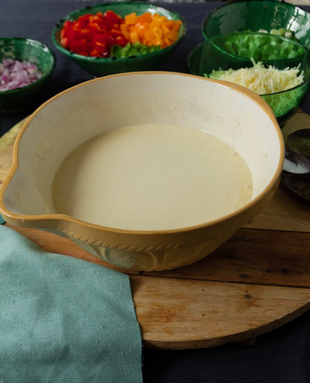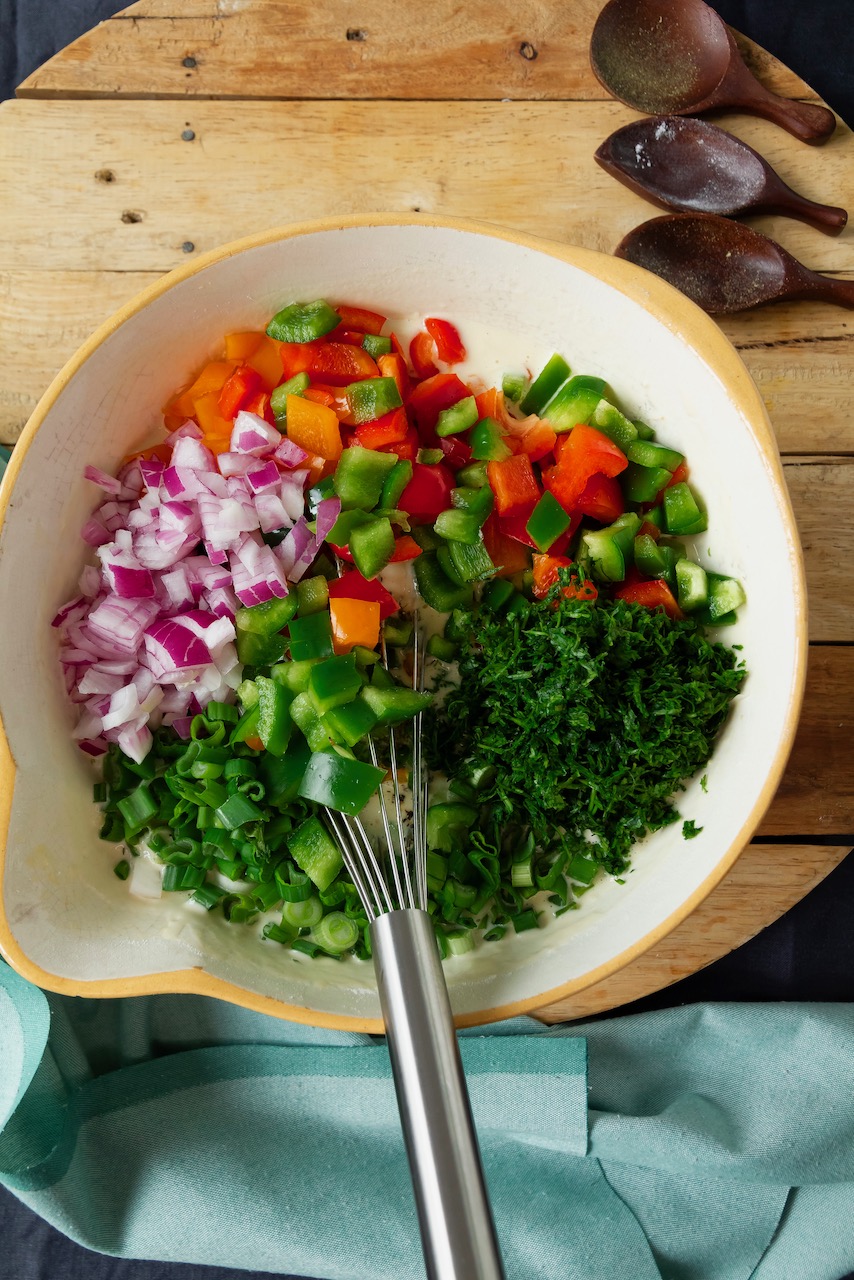 In der Zwischenzeit, Paprika und Zwiebel würfeln. Frühlingszwiebeln in Ringe schneiden und Petersilie fein hacken. Die Zutaten samt Thymian, Salz und Pfeffer dem Teig zufügen und alles gut mischen. Pizzakäse zufügen und gut durchrühren.