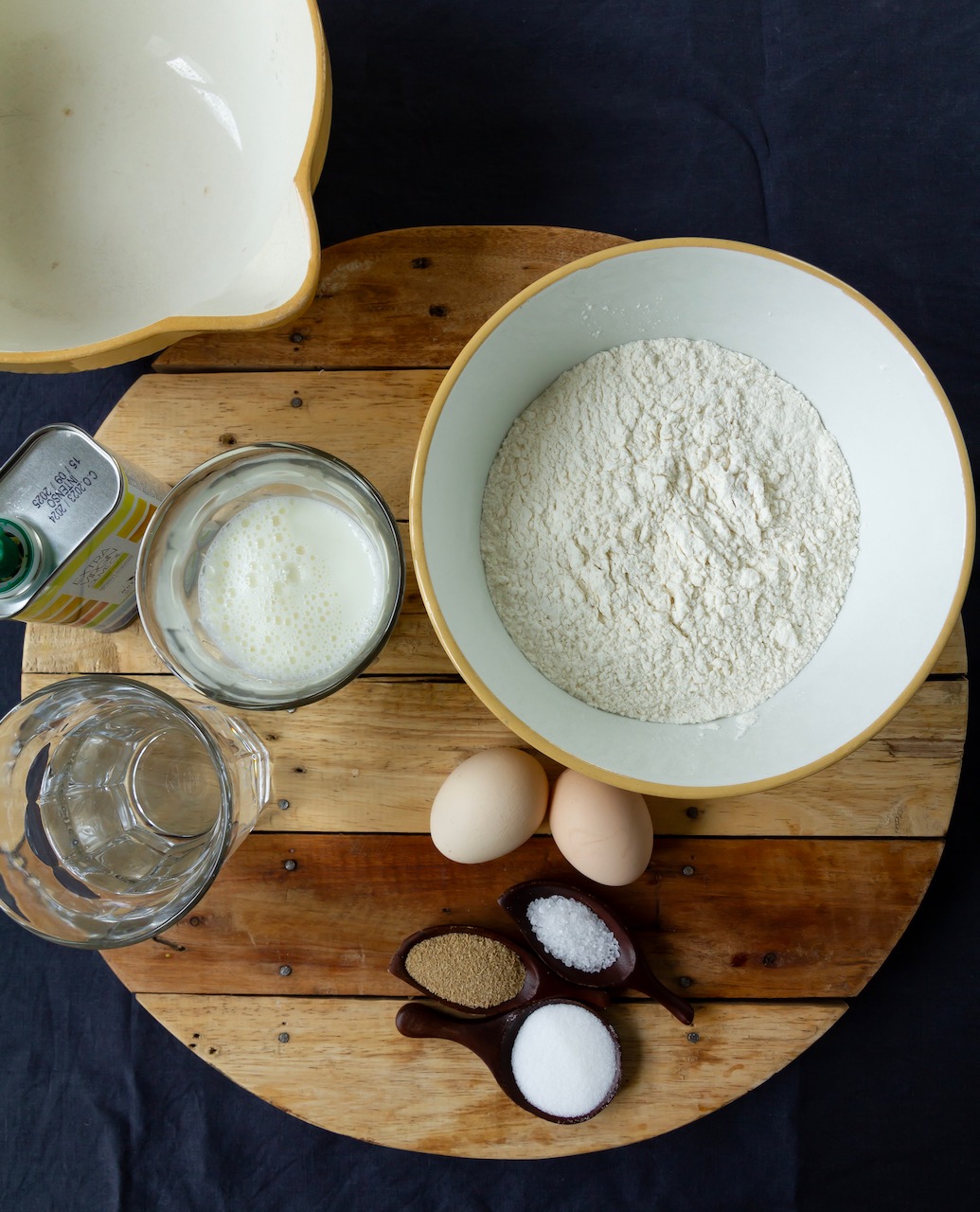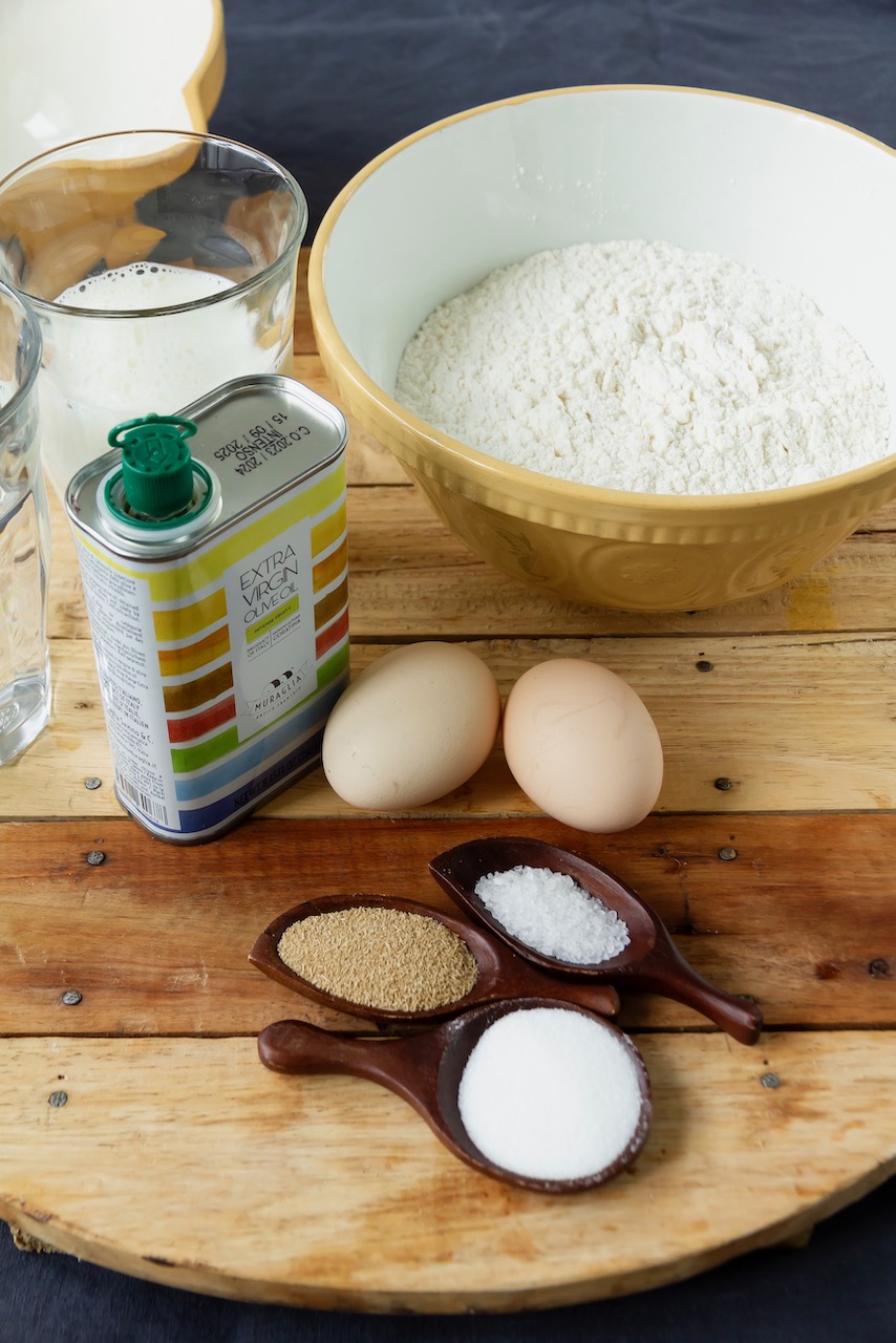 Die Eier in eine große Schüssel aufschlagen. Lauwarme Milch und Wasser zusammen mit Salz, Zucker, Trockenhefe, Olivenöl und Mehl zufügen und alles gut verrühren. Der Teig ist flüssig, das muss so. Für eine 1/2 Stunde abgedeckt ruhen lassen.