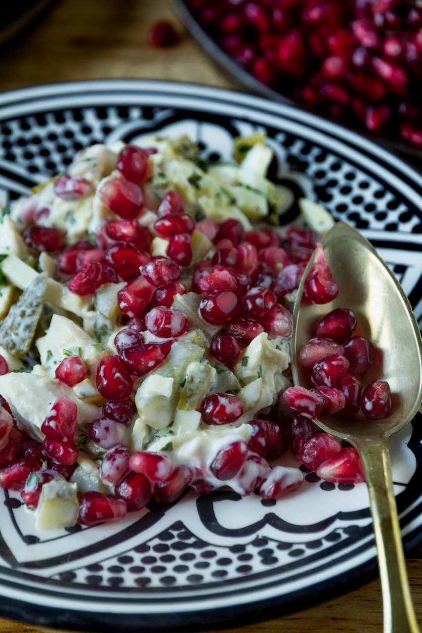 Wenn du einen besonderen Hähnchensalat zubereiten möchtest um die Geschmacksknospen in Verzückung zu setzen, dann empfehle ich dir meinen Salad-e Anar ba Morgh- Hähnchen-Granatapfel-Salat سالاد انار و مرغ. Hier treffen die Aromen der Welt aufeinander. Die leuchtend roten Perlen geben dem Salat nicht nur eine süß-säuerliche Note, sondern auch einen schönen Knack. Die Kombination aus Hähnchen, Eier, Salzgurken und Koriander sind einfach ein Gaumenschmaus. Bei diesem Rezept habe ich mich für Koriander entschieden, wer aber kein Koriander mag kann stattdessen auch Petersilie oder Minze verwenden. Das Rezept ist einfach und schnell zubereitet und perfekt für Shab-e Yalda, ein festliches Menü oder für Silvester. Weitere typische Gerichte für Shab-e Yalda findest du hier. Wir reichen ihn gerne als Appetizer, dass wir Mazeh (Mezze) nennen.