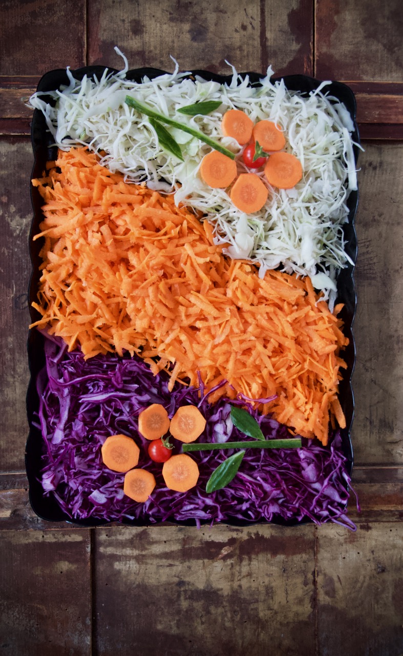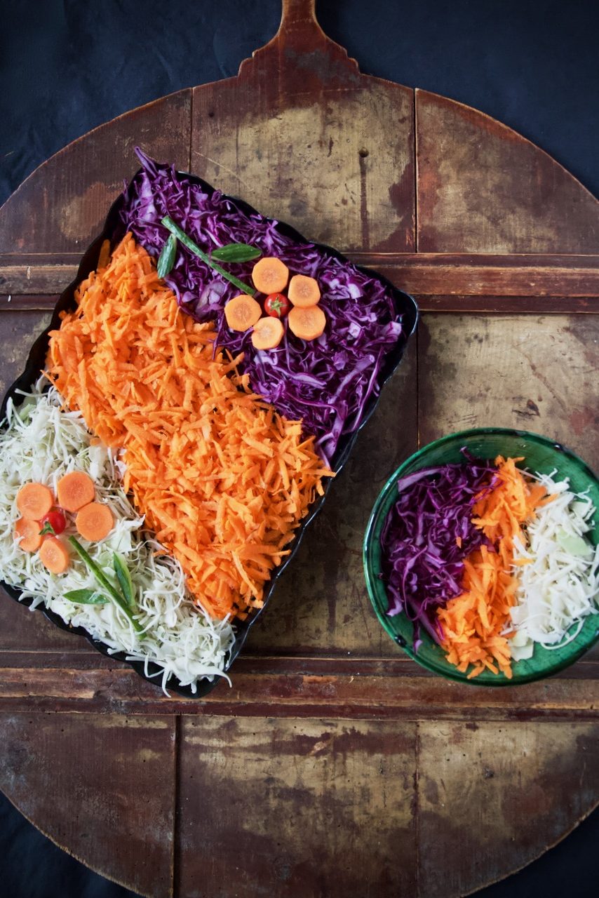 Rot- und Weißkohl mit eine Mandoline in feine Streifen schneiden. 3 Karotten von 4 fein reiben.