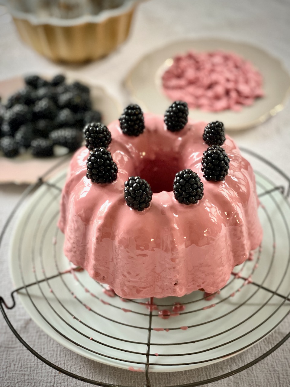 Der Gugelhupf schaut mit der rosa Glasur und den Brombeeren drauf sogar richtig gesund aus. Toller Trick, den merke ich mir.