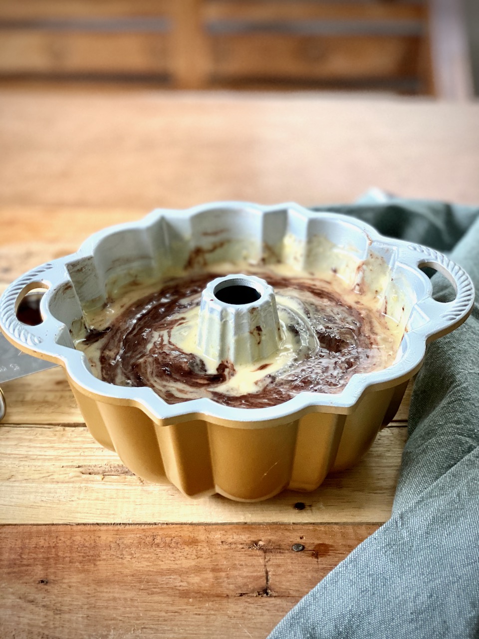 Place the light batter in the bottom of the mold and add the dark batter on top.