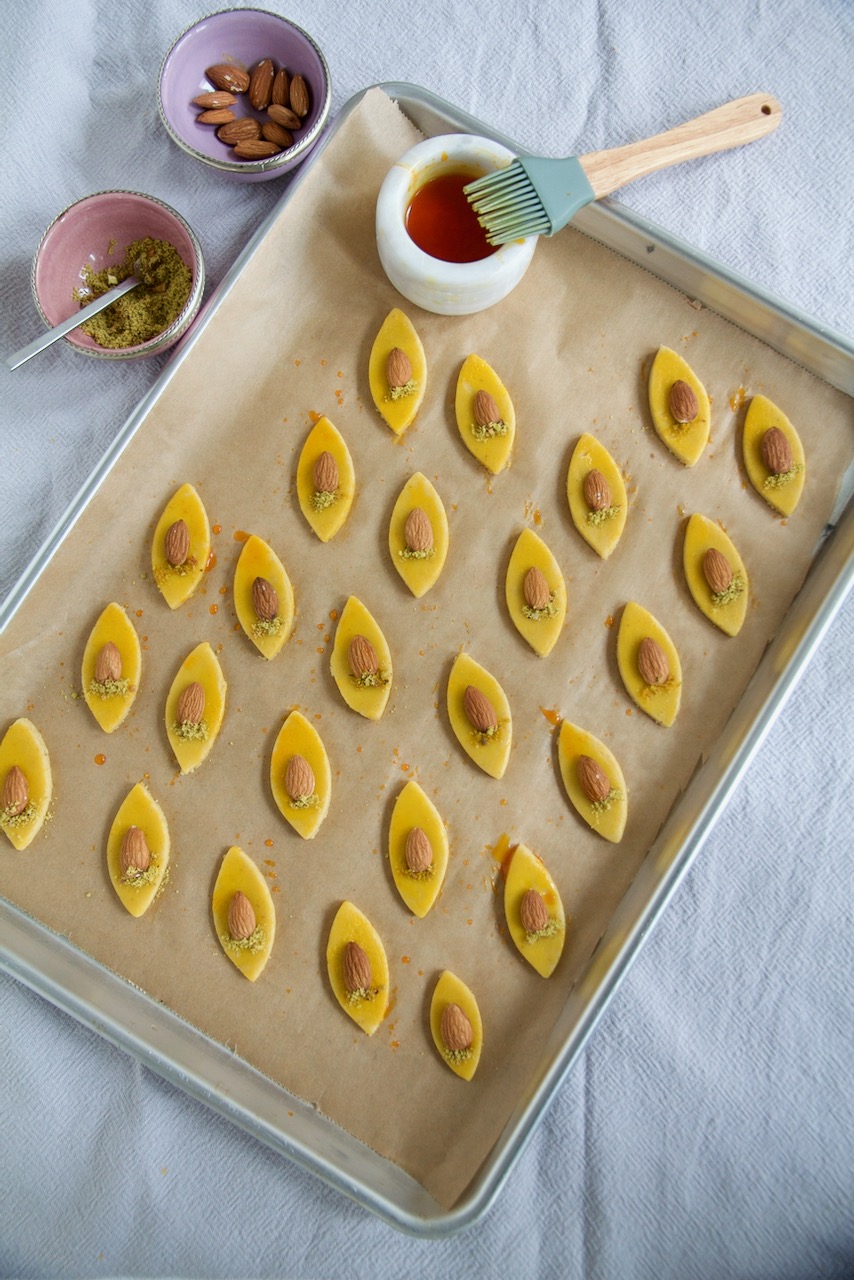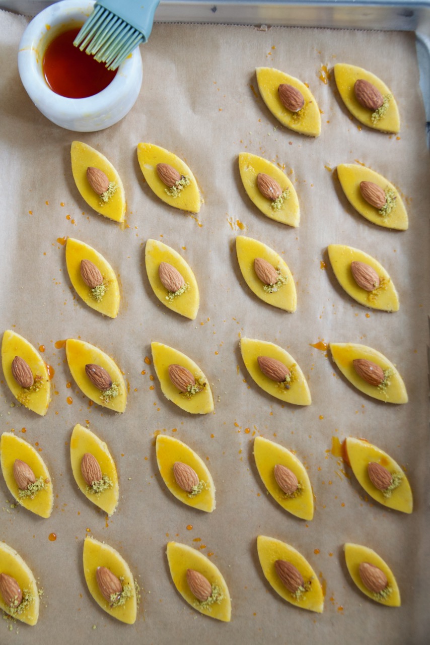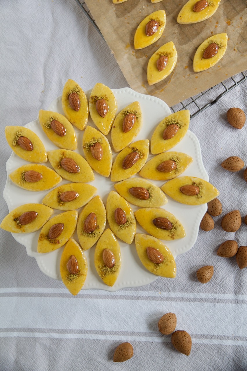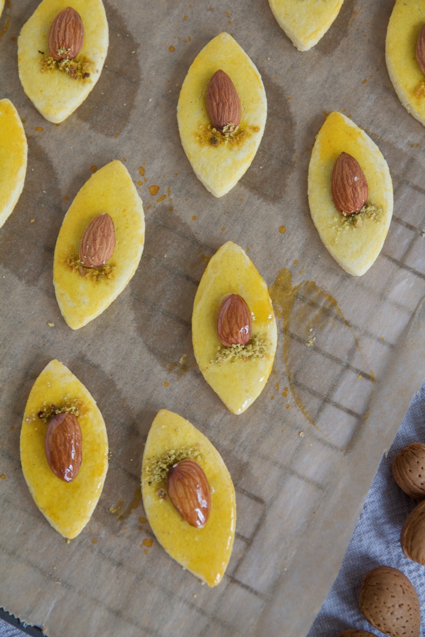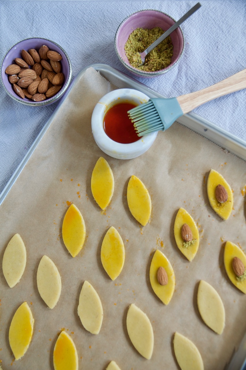 Mit einem Ausstecher Plätzchen ausstechen, mit Safranextrakt einstreichen, in der Mitte eine Mandel legen und mit etwas geriebenen Pistazien verzieren.
