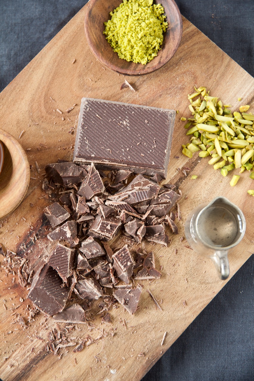 Schokolade klein hacken und über heißem Wasserdampf schmelzen. Mit einem Löffel die abgekühlten Madeleines mit Schokolade bestreichen und mit Pistazienstaub bestreuen.