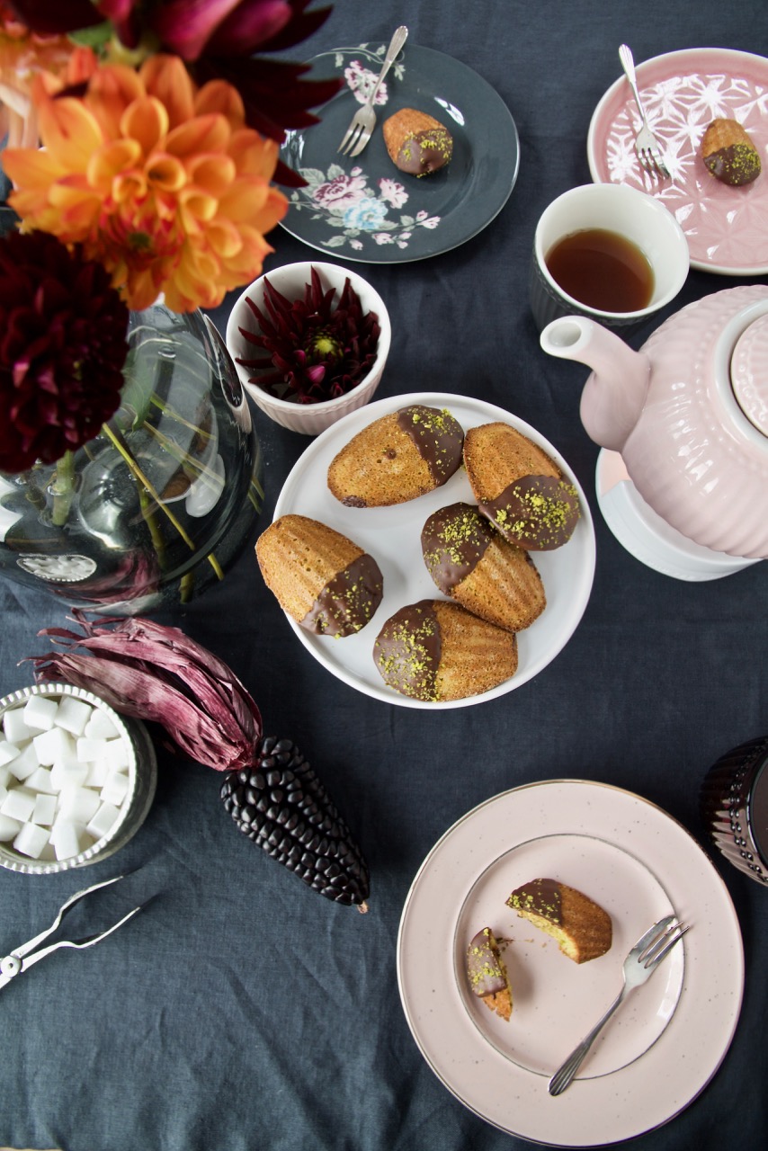 Was gibt es schöneres als sich mit guten Freunden zum Afternoon Tea zu treffen? Ich stelle mir eine Afternoon Tea Party auf jeden Fall mit einem Etagere mit lauter Köstlichkeiten vor. In der untersten Etage feine zarte Sandwiches, in der Mitte warme Scones mit clotted Cream und Marmelade und ganz oben die feinen Pastries. Natürlich dürfen meine Shirini Sadafi – Pistazien-Orangen Madeleines zum Afternoon Tea nicht fehlen. Dazu am Besten ausgewählte Teesorten, ein Gläschen Sekt, ruhige Musik im Hintergrund und jede Menge schöne Gespräche.