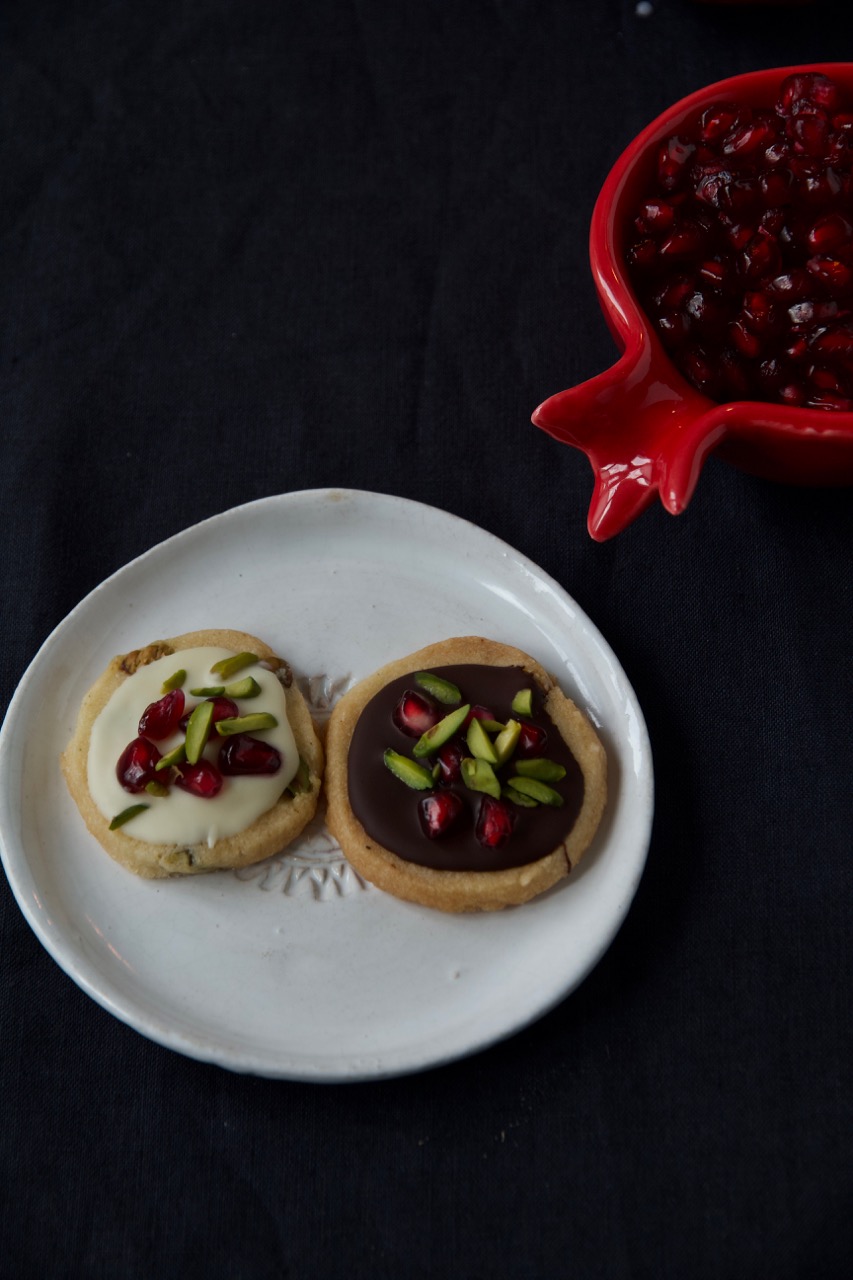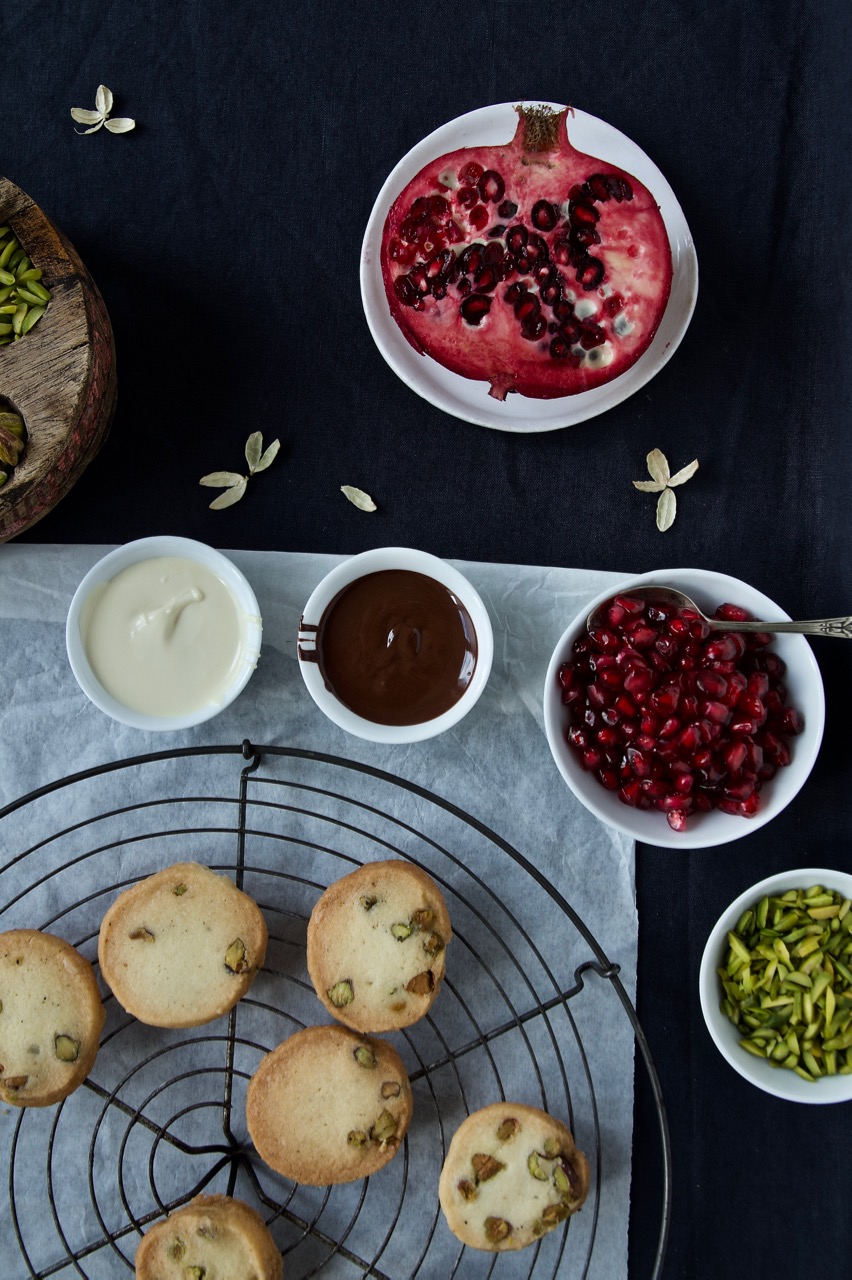 Gestern haben meine Familie und ich bis zur Morgendämmerung die längste Nacht des Jahres gefeiert. Denn gestern war Shab-e Yalda, die längste Nacht des Jahres. Gemeinsam haben wir Granatäpfel und Wassermelone gegessen, persischen Tee und Wein getrunken, gelacht und Gedichte gelesen. Für diesen besonderen Tag habe ich Shirini Shab-e Yalda – Pistazien-Kardamom-Taler mit Granatapfel gebacken. Die Pistazien Taler sind zart und mürbe, zergehen fast auf der Zunge. Kardamom gibt ihnen eine orientalische Note und das Topping aus weißer oder dunkler Schokolade wird mit Granatapfelkernen und Pistazienstifte verziert. Das Topping zerschmilzt beim hinein beissen auf der Zunge. Die Pistazien-Kardamom-Taler sind schnell gemacht und schmecken auch als Last-Minute Weihnachtsplätzchen hervorragend. Sie schmecken auch ohne Schokoladen Topping delikat.