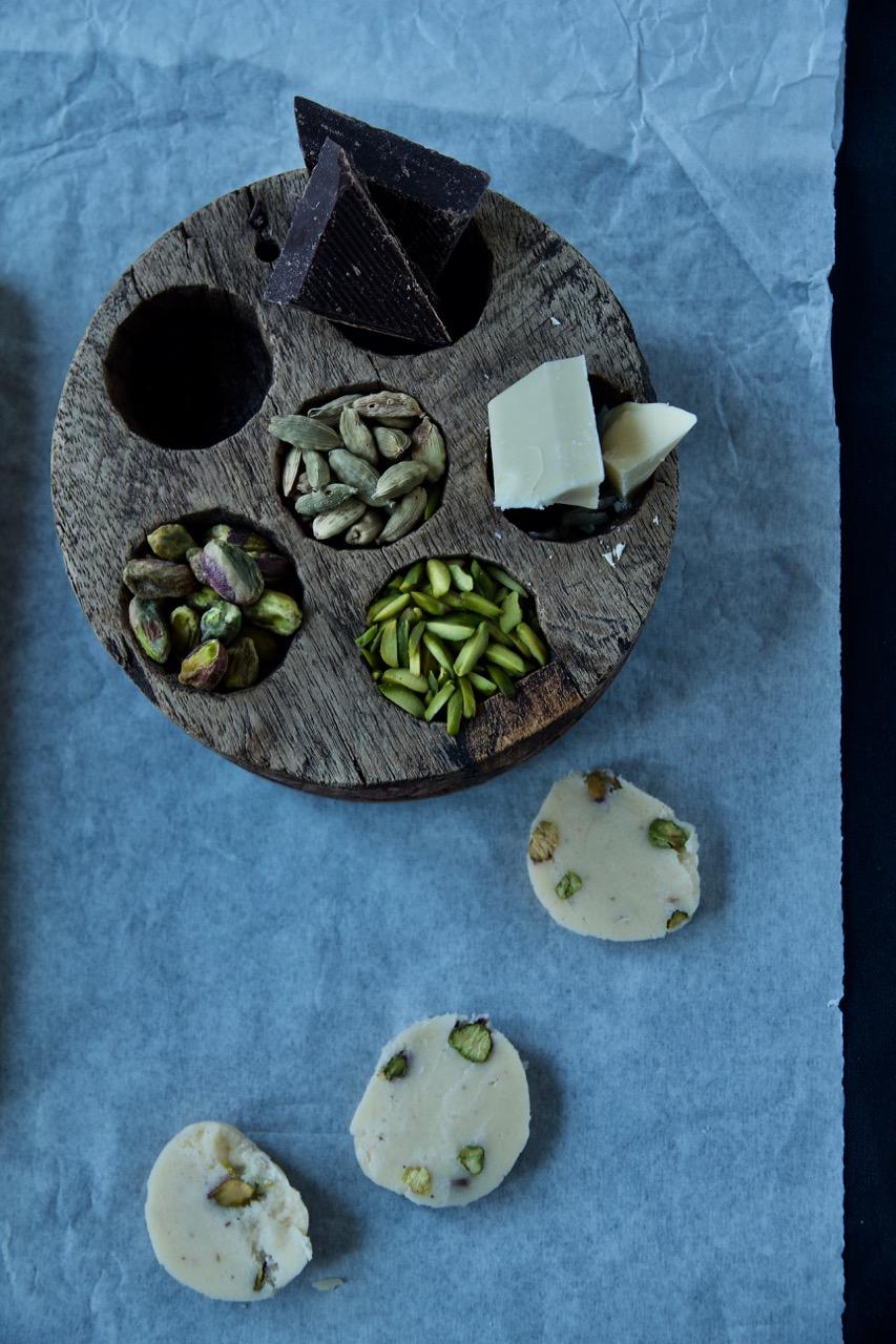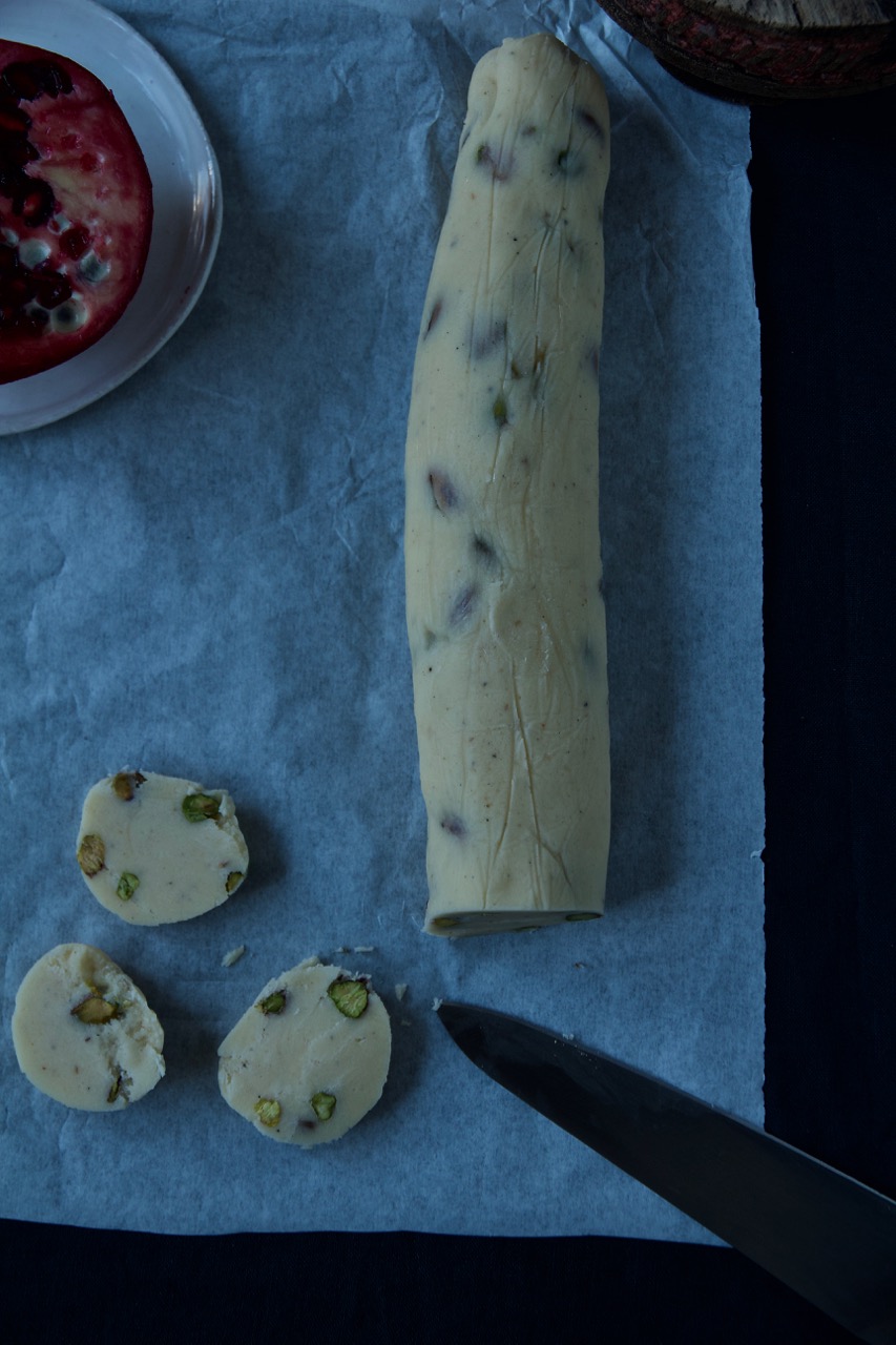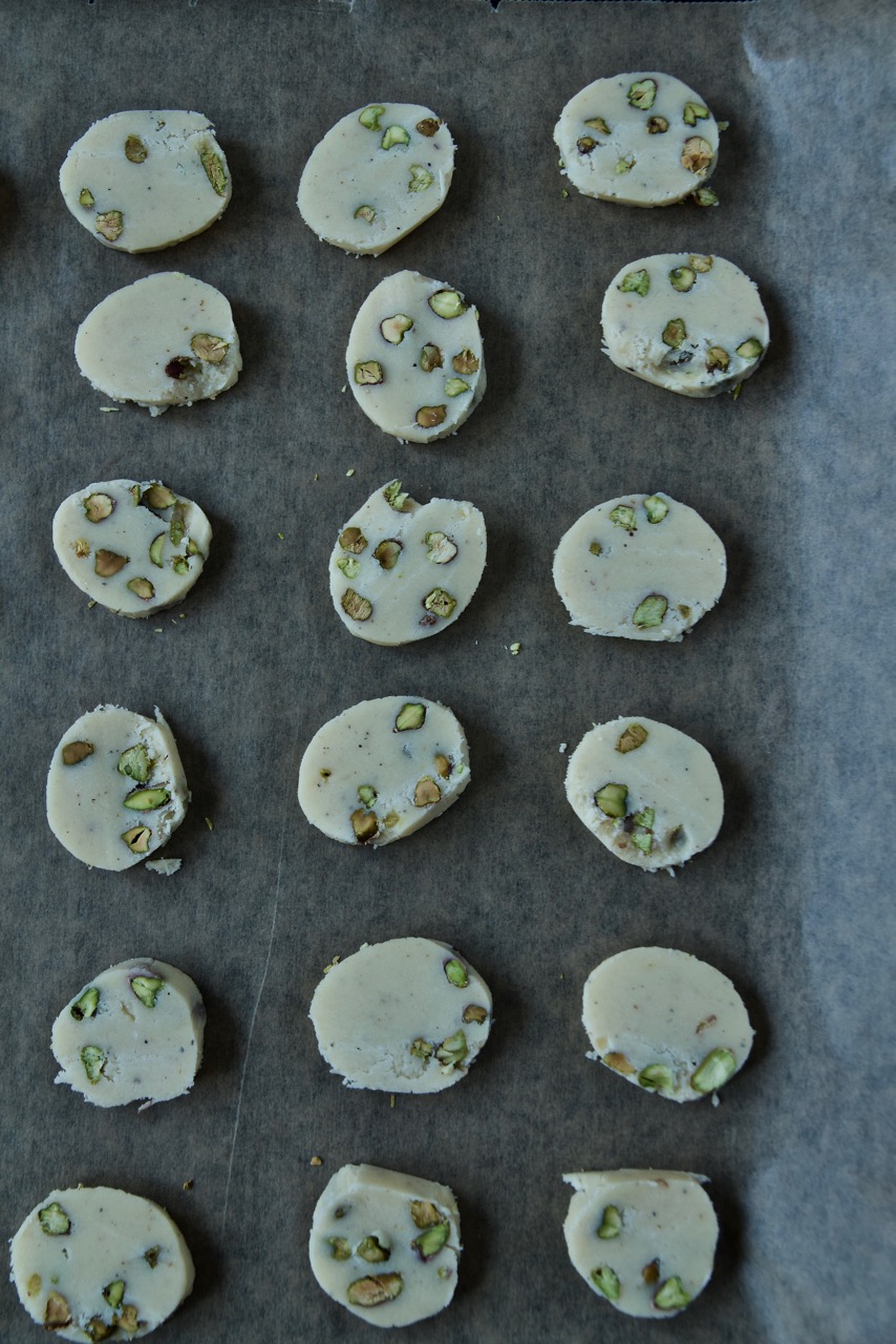 Butter mit dem Puderzucker im Mixer gut mischen. In der Zwischenzeit die Kardamomkapsel mit einem schweren Messer zerdrücken, damit sie aufknacken. Die Samen heraus holen und in einem Mörser fein mahlen. Gemahlenen Kardamom, Salz und Mehl zum Teig geben und so lange rühren bis ein homogener Teig entsteht. Pistazien nur noch unterheben und alles noch mal mit der Hand gut durch kneten, zu einer Stange rollen, in eine Plastikfolie oder wie ich in ein Bienenwachstuch einrollen. Für mindestens 2 Stunden (bei mir waren sie über Nacht) in den Kühlschrank stellen.