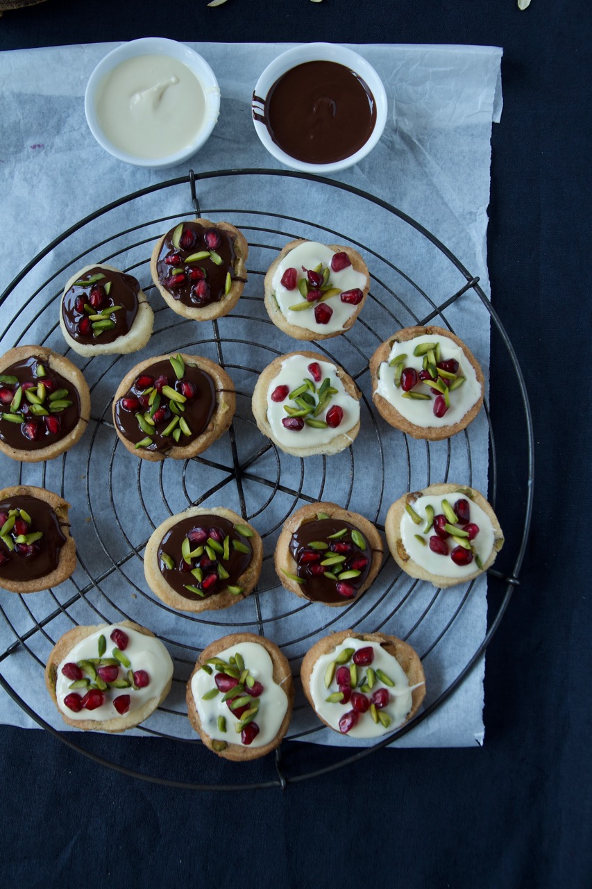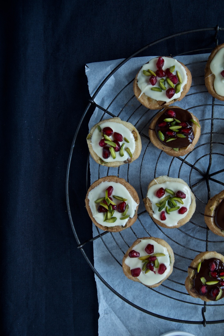 Die Pistazien Taler sind zart und mürbe, zergehen fast auf der Zunge. Kardamom gibt ihnen eine orientalische Note und das Topping aus weißer oder dunkler Schokolade wird mit Granatapfelkernen und Pistazienstifte verziert.
