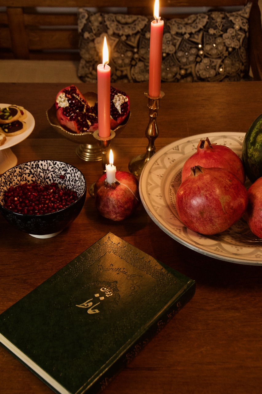 Der Granatapfel hat bis heute noch seinen festen Platz beim Shabe Yalda. Er zeigt die Röte der Sonne und soll Freude bringen. Wer seine Früchte an diesem Abend genießt, wird von Eifersuchts- und Hassgefühlen befreiet. Der Granatapfel wird je nach Gusto entweder mit Zucker oder mit Salz und Golpar bestreut und dann verzehrt. Golpar gleicht die kalten Eigenschaften von Granatapfel aus. Auch bei persischen Hochzeiten ist er unerlässlich. Lässt man ihn auf den Boden fallen, soll es Kinderglück bringen. Für Shab-e Yalda macht sich die Gastgeberin viel Mühe und entkernt dafür viele Granatäpfel. Die, wie Juwelen leuchtenden Kerne kommen in eine große Schale, damit der Gast sich nicht mit dem schälen und entkernen abmühen muss.