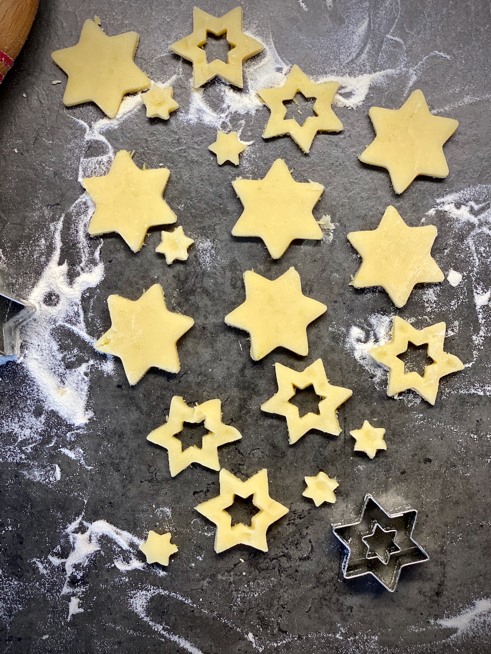 Teig auf einer bemehlten Arbeitsfläche ausrollen und aus der einen Hälfte runde, Granatapfelform* oder Sternen Plätzchen ausstechen. Die andere Hälfte runde Plätzchen oder Sternen Plätzchen mit einem Loch in der Mitte ausstechen.
