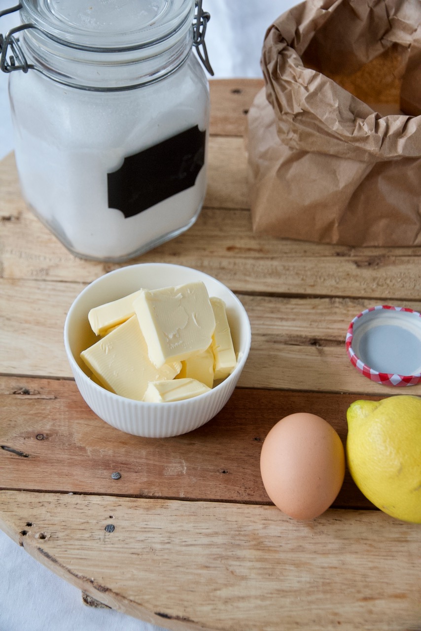 Put flour with baking powder, sugar, egg, butter, salt and lemon zest in a bowl and knead to a smooth dough.