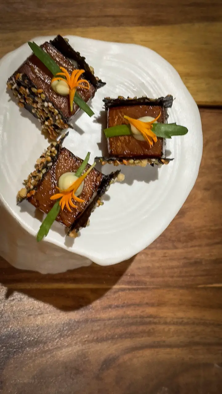 Der Abend startete einfach himmlisch! Als erstes wurden uns filigrane Amuse-Bouches serviert – kleine Kunstwerke, eingerahmt von knusprigen Nori-Blättern. So viel Geschmack in einem Bissen! Ein eleganter Gruß aus der Küche, der perfekt auf das einstimmte, was dann kam: Nils Henkel zauberte einen ersten Gang, der mich komplett begeistert hat – Schottischer Label Rouge Lachs an Fenchelsalat, umspielt von einem erfrischenden Cevichesud und veredelt mit Gewürzorange. Stell dir diese Kombination vor: die feine Süße des Lachses, die frische Säure des Suds, das leichte Anisaroma des Fenchels und dann dieser würzig-fruchtige Kick von der Orange. Ein Spiel aus Frische, Säure und würziger Tiefe und jeder Bissen war eine Explosion aus Aromen – einfach ein Traum! Zur Vorspeise wurde uns der Lighea Wein aus dem Hause Donnafugata kredenzt – ein eleganter weißer Sizilianer, der aus der aromatischen Zibibbo-Traube (Muscat of Alexandria) gekeltert wird.