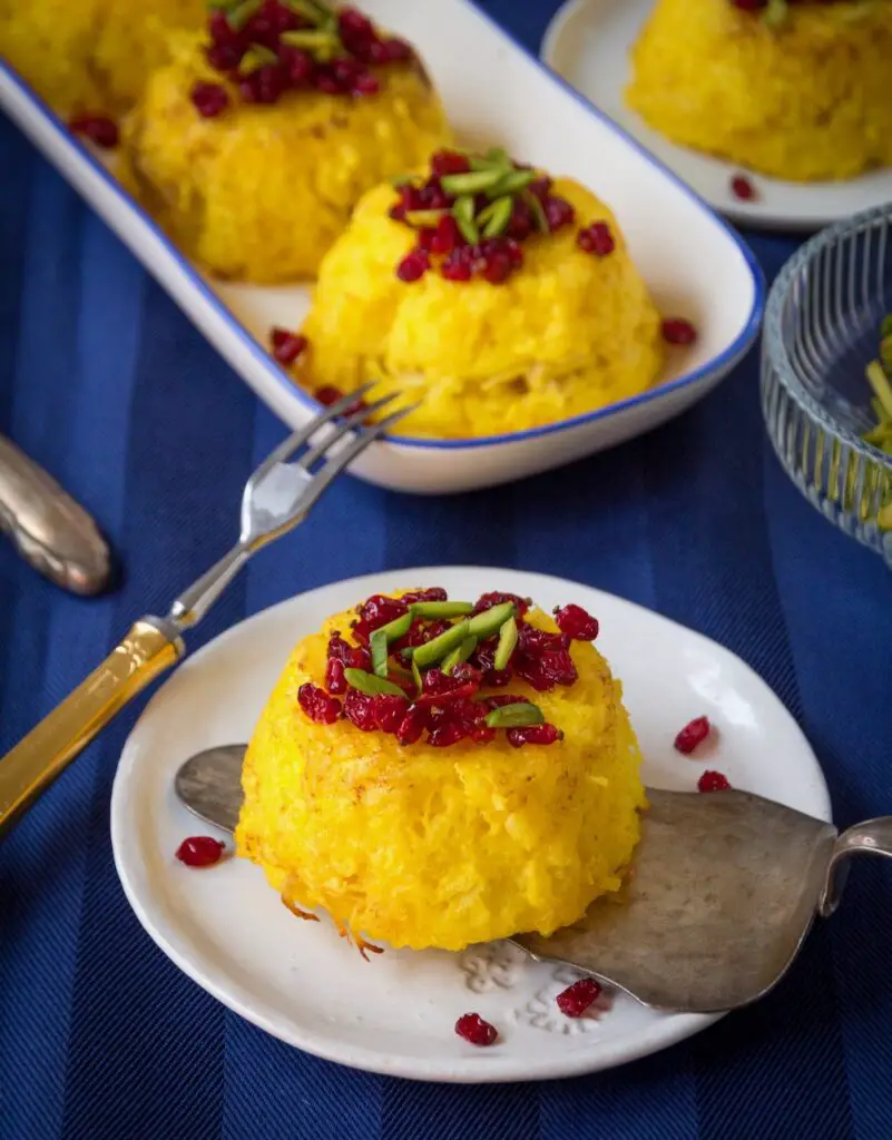 Tah Chin mit Berberitzen und Pistazien garnieren. Am Tisch den Reiskuchen wie eine Torte anschneiden und jeder erhält ein Stück vom köstlichen Reiskuchen.